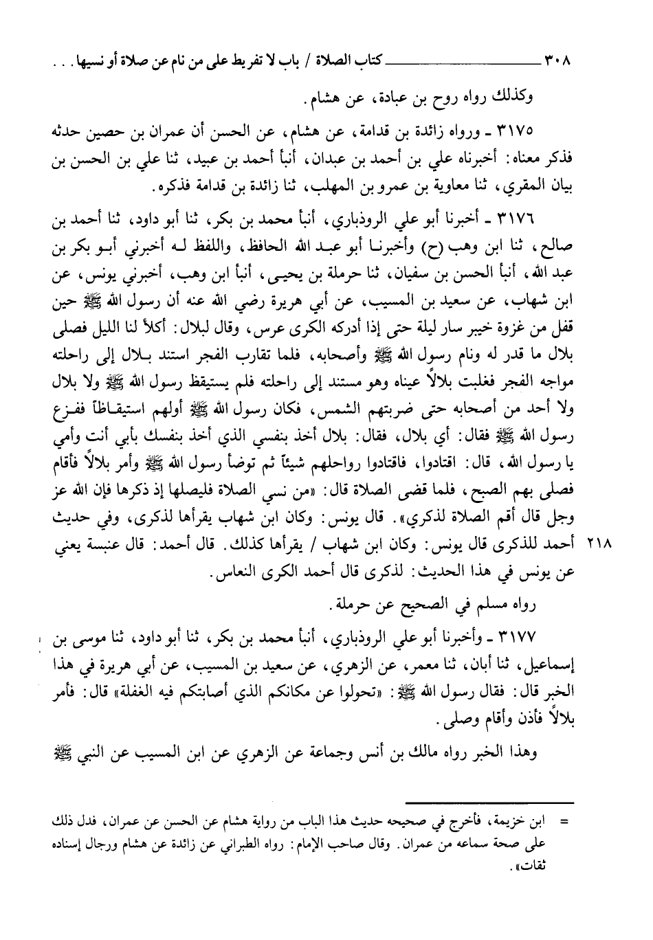 3176 - أَخْبَرَنَا أَبُو عَلِيٍّ الرُّوذْبَارِيُّ، أنبأ مُحَمَّدُ بْنُ بَكْرٍ، ثنا أَبُو دَاوُدَ، ثنا أَحْمَدُ بْنُ صَالِحٍ، ثنا ابْنُ وَهْبٍ، ح وَأَخْبَرَنَا أَبُو عَبْدِ اللهِ الْحَافِظُ وَاللَّفْظُ لَهُ أَخْبَرَنِي أَبُو بَكْرِ بْنُ عَبْدِ اللهِ، أنبأ الْحَسَنُ بْنُ سُفْيَانَ، ثنا حَرْمَلَةُ بْنُ يَحْيَى، أنبأ ابْنُ وَهْبٍ، أَخْبَرَنِي يُونُسُ، عَنِ ابْنِ شِهَابٍ، عَنْ سَعِيدِ بْنِ الْمُسَيِّبِ، عَنْ أَبِي هُرَيْرَةَ رَضِيَ اللهُ عَنْهُ أَنَّ رَسُولَ اللهِ صَلَّى اللهُ عَلَيْهِ وَسَلَّمَ حِينَ قَفَلَ مِنْ غَزْوَةِ خَيْبَرَ سَارَ لَيْلَةً حَتَّى إِذَا أَدْرَكَهُ الْكَرَى عَرَّسَ، وَقَالَ لِبِلَالٍ: " اكْلَأْ لَنَا اللَّيْلَ " فَصَلَّى بِلَالٌ مَا قُدِّرَ لَهُ وَنَامَ رَسُولُ اللهِ صَلَّى اللهُ عَلَيْهِ وَسَلَّمَ وَأَصْحَابُهُ، فَلَمَّا تَقَارَبَ الْفَجْرُ اسْتَنَدَ بِلَالٌ إِلَى رَاحِلَتِهِ مُوَاجِهَ الْفَجْرِ، فَغَلَبَتْ بِلَالًا عَيْنَاهُ وَهُوَ مُسْتَنِدٌ إِلَى رَاحِلَتِهِ فَلَمْ يَسْتَيْقِظْ رَسُولُ اللهِ صَلَّى اللهُ عَلَيْهِ وَسَلَّمَ، وَلَا بِلَالٌ وَلَا أَحَدٌ مِنْ أَصْحَابِهِ حَتَّى ضَرَبَتْهُمُ الشَّمْسُ، فَكَانَ رَسُولُ اللهِ صَلَّى اللهُ عَلَيْهِ وَسَلَّمَ أَوَّلَهُمُ اسْتِيقَاظًا فَفَزِعَ رَسُولُ اللهِ صَلَّى اللهُ عَلَيْهِ وَسَلَّمَ، فَقَالَ: " أَيْ بِلَالُ " فَقَالَ بِلَالٌ: أَخَذَ بِنَفْسِي الَّذِي أَخَذَ بِنَفْسِكَ بِأَبِي أَنْتَ وَأُمِّي يَا رَسُولَ اللهِ، قَالَ: " اقْتَادُوا "، فَاقْتَادُوا رَوَاحِلَهُمْ شَيْئًا ثُمَّ تَوَضَّأَ رَسُولُ اللهِ صَلَّى اللهُ عَلَيْهِ وَسَلَّمَ وَأَمَرَ بِلَالًا فَأَقَامَ الصَّلَاة فَصَلَّى بِهُمُ الصُّبْحَ، فَلَمَّا قَضَى الصَّلَاةَ قَالَ: " §مَنْ نَسِيَ الصَّلَاةَ فَلْيُصَلِّهَا إِذَا ذَكَرَهَا فَإِنَّ اللهَ عَزَّ وَجَلَّ قَالَ {أَقِمِ الصَّلَاةَ لِذِكْرِي} [طه: 14] " قَالَ يُونُسُ: وَكَانَ ابْنُ شِهَابٍ يَقْرَؤُهَا " لِذِكْرَى " وَفِي حَدِيثِ أَحْمَدَ " لِلذِّكْرَى " قَالَ يُونُسُ وَكَانَ ابْنُ شِهَابٍ يَقْرَؤُهَا كَذَلِكَ قَالَ أَحْمَدُ قَالَ عَنْبَسَةُ، يَعْنِي عَنْ يُونُسَ، فِي هَذَا الْحَدِيثِ " لِذِكْرَى " قَالَ أَحْمَدُ: الْكَرَى النُّعَاسُ رَوَاهُ مُسْلِمٌ فِي الصَّحِيحِ، عَنْ حَرْمَلَةَ