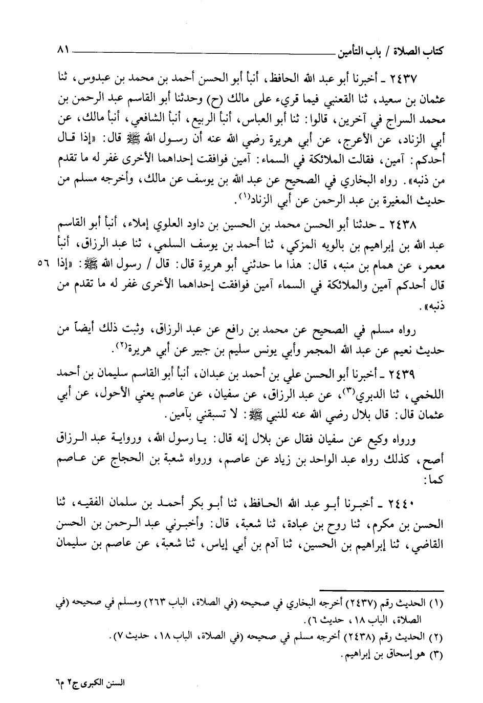 2437 - أَخْبَرَنَا أَبُو عَبْدِ اللهِ الْحَافِظُ، أنبأ أَبُو الْحَسَنِ أَحْمَدُ بْنُ مُحَمَّدِ بْنِ عَبْدُوسٍ، ثنا عُثْمَانُ بْنُ سَعِيدٍ، ثنا الْقَعْنَبِيُّ، فِيمَا قُرِئَ عَلَى مَالِكٍ (ح) وَحَدَّثَنَا أَبُو الْقَاسِمِ عَبْدُ الرَّحْمَنِ بْنُ مُحَمَّدٍ السَّرَّاجُ فِي آخَرِينَ قَالُوا: ثنا أَبُو الْعَبَّاسِ، أنبأ الرَّبِيعُ، أنبأ الشَّافِعِيُّ، أنبأ مَالِكٌ، عَنْ أَبِي الزِّنَادِ، عَنِ الْأَعْرَجِ، عَنْ أَبِي هُرَيْرَةَ رَضِيَ اللهُ عَنْهُ أَنَّ رَسُولَ اللهِ صَلَّى اللهُ عَلَيْهِ وَسَلَّمَ قَالَ: " §إِذَا قَالَ أَحَدُكُمْ: آمِينَ، فَقَالَتِ الْمَلَائِكَةُ فِي السَّمَاءِ: آمِينَ فَوَافَقَتْ إِحْدَاهُمَا الْأُخْرَى، غُفِرَ لَهُ مَا تَقَدَّمَ مِنْ ذَنْبِهِ " رَوَاهُ الْبُخَارِيُّ فِي الصَّحِيحِ، عَنْ عَبْدِ اللهِ بْنِ يُوسُفَ، عَنْ مَالِكٍ، وَأَخْرَجَهُ مُسْلِمٌ مِنْ حَدِيثِ الْمُغِيرَةِ بْنِ عَبْدِ الرَّحْمَنِ، عَنْ أَبِي الزِّنَادِ