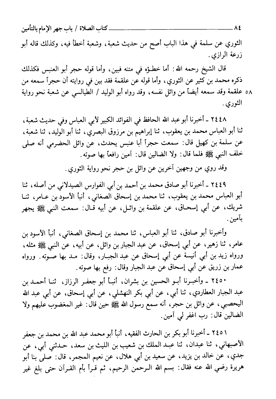 2448 - أَخْبَرَنَا أَبُو عَبْدِ اللهِ الْحَافِظُ فِي الْفَوَائِدِ الْكَبِيرِ لِأَبِي الْعَبَّاسِ، وَفِي حَدِيثِ شُعْبَةَ، ثنا أَبُو الْعَبَّاسِ مُحَمَّدُ بْنُ يَعْقُوبَ، ثنا إِبْرَاهِيمُ بْنُ مَرْزُوقٍ الْبَصْرِيُّ، ثنا أَبُو الْوَلِيدِ، ثنا شُعْبَةُ، عَنْ سَلَمَةَ بْنِ كُهَيْلٍ قَالَ: سَمِعْتُ حُجْرًا أَبَا عَنْبَسٍ يُحَدِّثُ عَنْ وَائِلٍ الْحَضْرَمِيِّ أَنَّهُ صَلَّى خَلْفَ النَّبِيِّ صَلَّى اللهُ عَلَيْهِ وَسَلَّمَ، فَلَمَّا قَالَ: " §وَلَا الضَّالِّينَ " قَالَ: " آمِينَ " رَافِعًا بِهَا صَوْتَهُ " وَقَدْ رُوِيَ مِنْ وَجْهَيْنِ آخَرَيْنِ، عَنْ وَائِلِ بْنِ حُجْرٍ نَحْوَ رِوَايَةِ الثَّوْرِيِّ