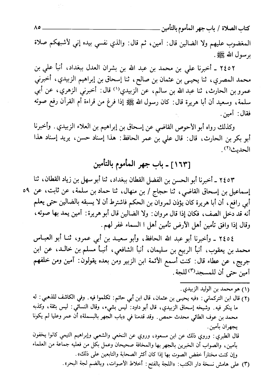 2452 - أَخْبَرَنَا عَلِيُّ بْنُ مُحَمَّدِ بْنِ عَبْدِ اللهِ بْنِ بِشْرَانَ الْعَدْلُ بِبَغْدَادَ أنبأ عَلِيُّ بْنُ مُحَمَّدٍ الْمِصْرِيُّ، ثنا يَحْيَى بْنُ عُثْمَانَ بْنِ صَالِحٍ، ثنا إِسْحَاقُ بْنُ إِبْرَاهِيمَ الزُّبَيْدِيُّ، أَخْبَرَنِي عَمْرُو بْنُ الْحَارِثِ، ثنا عَبْدُ اللهِ بْنُ سَالِمٍ، عَنِ الزُّبَيْدِيِّ قَالَ: أَخْبَرَنِي الزُّهْرِيُّ، عَنْ أَبِي سَلَمَةَ، وَسَعِيدٍ، أَنَّ أَبَا هُرَيْرَةَ قَالَ: كَانَ رَسُولُ اللهِ صَلَّى اللهُ عَلَيْهِ وَسَلَّمَ " §إِذَا فَرَغَ مِنْ قِرَاءَةِ أُمِّ الْقُرْآنِ رَفَعَ صَوْتَهُ، فَقَالَ: آمِينَ " وَكَذَلِكَ رَوَاهُ أَبُو الْأَحْوَصِ الْقَاضِي، عَنْ إِسْحَاقَ بْنِ إِبْرَاهِيمَ بْنِ الْعَلَاءِ الزُّبَيْدِيِّ وَأَخْبَرَنَا أَبُو بَكْرِ بْنُ الْحَارِثِ قَالَ: قَالَ عَلِيُّ بْنُ عُمَرَ الْحَافِظُ: هَذَا إِسْنَادٌ حَسَنٌ، يُرِيدُ إِسْنَادَ هَذَا الْحَدِيثِ