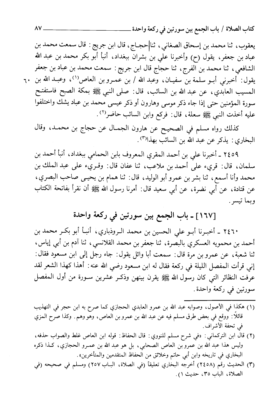 2460 - أَخْبَرَنَا أَبُو عَلِيٍّ الْحُسَيْنُ بْنُ مُحَمَّدٍ الرُّوذْبَارِيُّ، أنبأ أَبُو بَكْرٍ مُحَمَّدُ بْنُ أَحْمَدَ بْنِ مَحْمَوَيْهِ الْعَسْكَرِيُّ بِالْبَصْرَةِ، ثنا جَعْفَرُ بْنُ مُحَمَّدٍ الْقَلَانِسِيُّ، ثنا آدَمُ بْنُ أَبِي إِيَاسٍ، ثنا شُعْبَةُ، عَنْ عَمْرِو بْنِ مَرَّةَ قَالَ: سَمِعْتُ أَبَا وَائِلٍ يَقُولُ: جَاءَ رَجُلٌ إِلَى ابْنِ مَسْعُودٍ، فَقَالَ: " §إِنِّي قَرَأْتُ الْمُفَصَّلَ اللَّيْلَةَ فِي رَكْعَةٍ، فَقَالَ لَهُ ابْنُ مَسْعُودٍ رَضِيَ اللهُ عَنْهُ: أَهَذًّا كَهَذِّ الشِّعْرِ؟ لَقَدْ عَرَفْتُ النَّظَائِرَ الَّتِي كَانَ رَسُولُ اللهِ صَلَّى اللهُ عَلَيْهِ وَسَلَّمَ يَقْرُنُ بَيْنَهُنَّ، وَذَكَرَ عِشْرِينَ سُورَةً مِنْ أَوَّلِ الْمُفَصَّلِ سُورَتَيْنِ فِي رَكْعَةٍ وَاحِدَةٍ " -[88]- رَوَاهُ الْبُخَارِيُّ فِي الصَّحِيحِ، عَنْ آدَمَ، وَرَوَاهُ مُسْلِمٌ مِنْ وَجْهٍ آخَرَ، عَنْ شُعْبَةَ