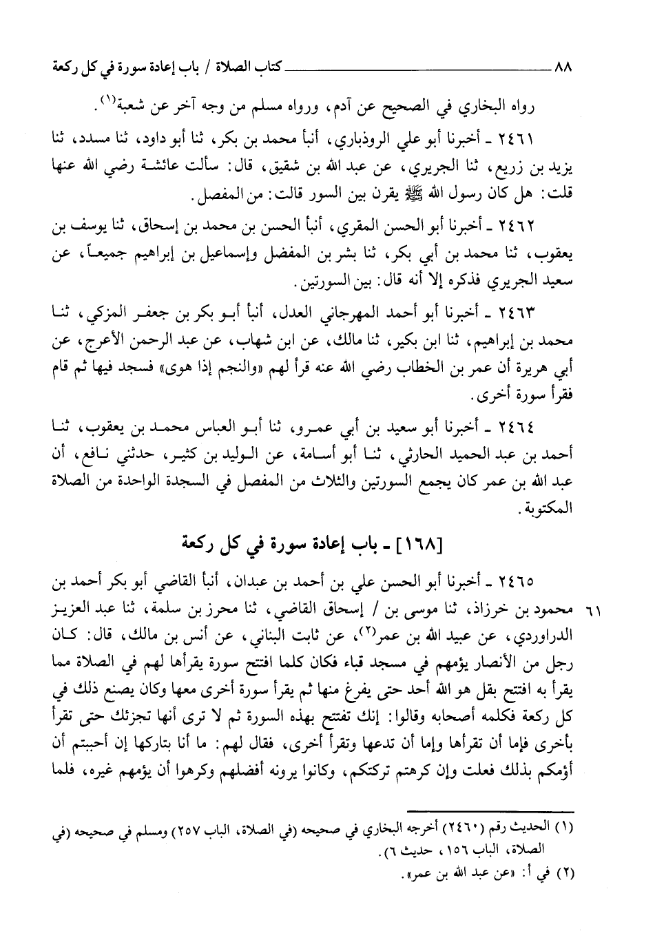 2464 - أَخْبَرَنَا أَبُو سَعِيدِ بْنُ أَبِي عَمْرٍو، ثنا أَبُو الْعَبَّاسِ مُحَمَّدُ يَعْقُوبَ، ثنا أَحْمَدُ بْنُ عَبْدِ الْحَمِيدِ الْحَارِثِيُّ، ثنا أَبُو أُسَامَةَ، عَنِ الْوَلِيدِ بْنِ كَثِيرٍ، حَدَّثَنِي نَافِعٌ، أَنَّ عَبْدَ اللهِ بْنَ عُمَرَ كَانَ §" يَجْمَعُ السُّورَتَيْنِ وَالثَّلَاثَ مِنَ الْمُفَصَّلِ فِي السَّجْدَةِ الْوَاحِدَةِ مِنَ الصَّلَاةِ الْمَكْتُوبَةِ "