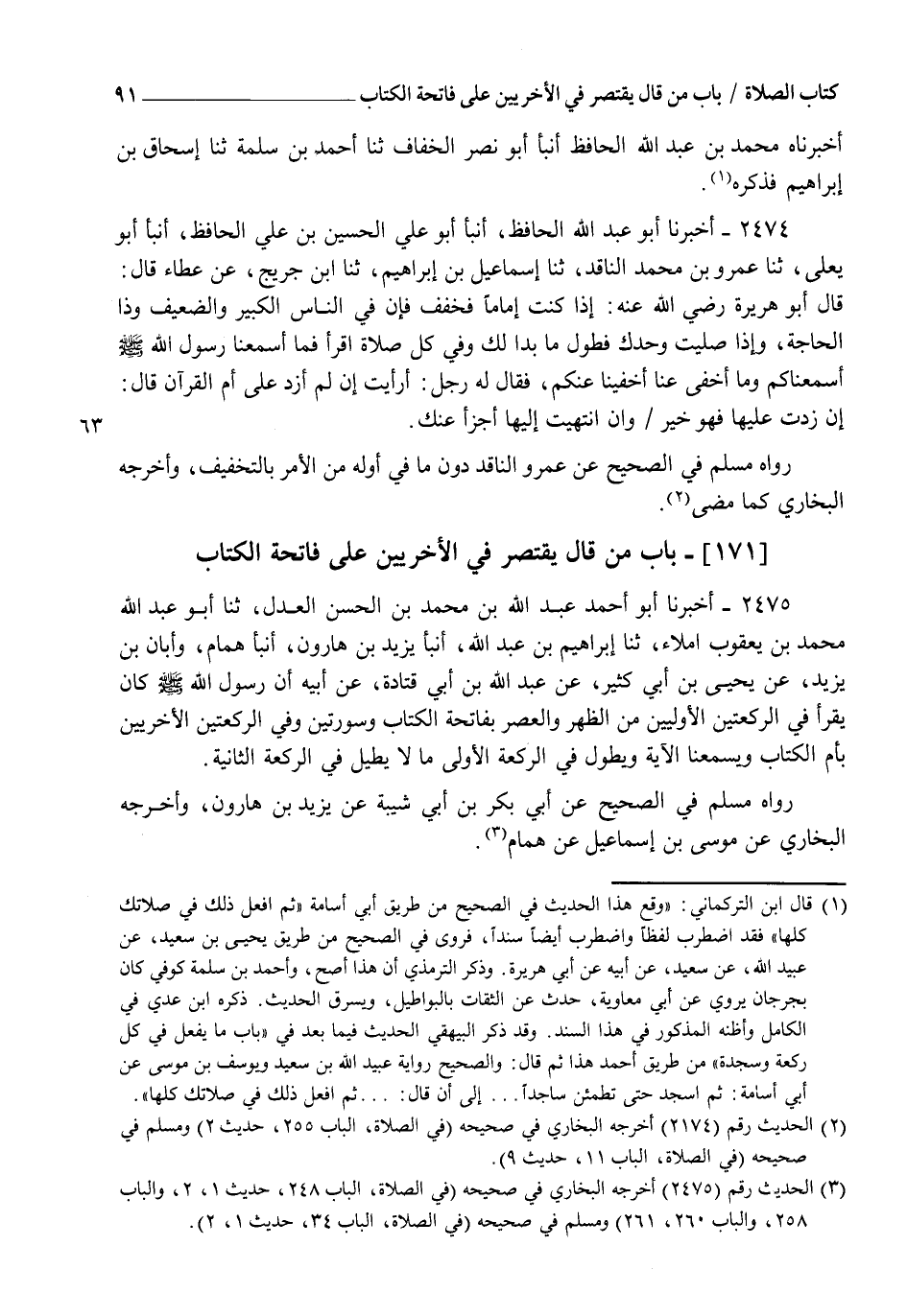 2474 - أَخْبَرَنَا أَبُو عَبْدِ اللهِ الْحَافِظُ، أنبأ أَبُو عَلِيٍّ الْحُسَيْنُ بْنُ عَلِيٍّ الْحَافِظُ، أنبأ أَبُو يَعْلَى، ثنا عَمْرُو بْنُ مُحَمَّدٍ النَّاقِدُ، ثنا إِسْمَاعِيلُ بْنُ إِبْرَاهِيمَ، ثنا ابْنُ جُرَيْجٍ، عَنْ عَطَاءٍ قَالَ: قَالَ أَبُو هُرَيْرَةَ رَضِيَ اللهُ عَنْهُ " §إِذَا كُنْتَ إِمَامًا فَخَفِّفْ، فَإِنَّ فِي النَّاسِ الْكَبِيرَ وَالضَّعِيفَ، وَذَا الْحَاجَةِ، وَإِذَا صَلَّيْتَ وَحْدَكَ فَطَوِّلْ مَا بَدَا لَكَ، وَفِي كُلِّ صَلَاةٍ اقْرَأْ، فَمَا أَسْمَعَنَا رَسُولُ اللهِ صَلَّى اللهُ عَلَيْهِ وَسَلَّمَ أَسْمَعْنَاكُمْ، وَمَا أَخْفَى عَنَّا أَخْفَيْنَا عَنْكُمْ، فَقَالَ لَهُ رَجُلٌ: أَرَأَيْتَ إِنْ لَمْ أَزِدْ عَلَى أُمِّ الْقُرْآنِ؟ قَالَ: إِنْ زِدْتَ عَلَيْهَا فَهُوَ خَيْرٌ، وَإِنِ انْتَهَيْتَ إِلَيْهَا أَجْزَأَ عَنْكَ " رَوَاهُ مُسْلِمٌ فِي الصَّحِيحِ، عَنْ عَمْرٍو النَّاقِدِ دُونَ مَا فِي أَوَّلِهِ مِنَ الْأَمْرِ بِالتَّخْفِيفِ وَأَخْرَجَهُ الْبُخَارِيُّ كَمَا مَضَى