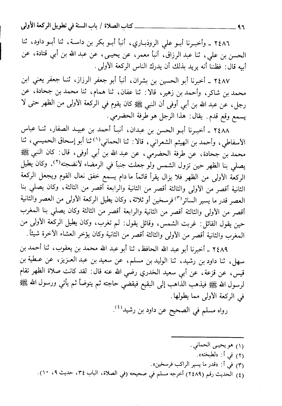 2487 - أَخْبَرَنَا أَبُو الْحُسَيْنِ بْنُ بُشْرَانَ، أنبأ أَبُو جَعْفَرٍ الرَّزَّازُ، ثنا جَعْفَرٌ يَعْنِي ابْنَ مُحَمَّدِ بْنَ شَاكِرٍ، وَأَحْمَدُ بْنُ زُهَيْرٍ قَالَا: ثنا عَفَّانُ، ثنا هَمَّامٌ، ثنا مُحَمَّدُ بْنُ جُحَادَةَ، عَنْ رَجُلٍ، عَنْ عَبْدِ اللهِ بْنِ أَبِي أَوْفَى، أَنَّ النَّبِيَّ صَلَّى اللهُ عَلَيْهِ وَسَلَّمَ §" كَانَ يَقُومُ فِي الرَّكْعَةِ الْأُولَى مِنَ الظُّهْرِ حَتَّى لَا يَسْمَعُ وَقْعَ قَدَمٍ " يُقَالُ: هَذَا الرَّجُلُ هُوَ طَرَفَةُ الْحَضْرَمِيُّ