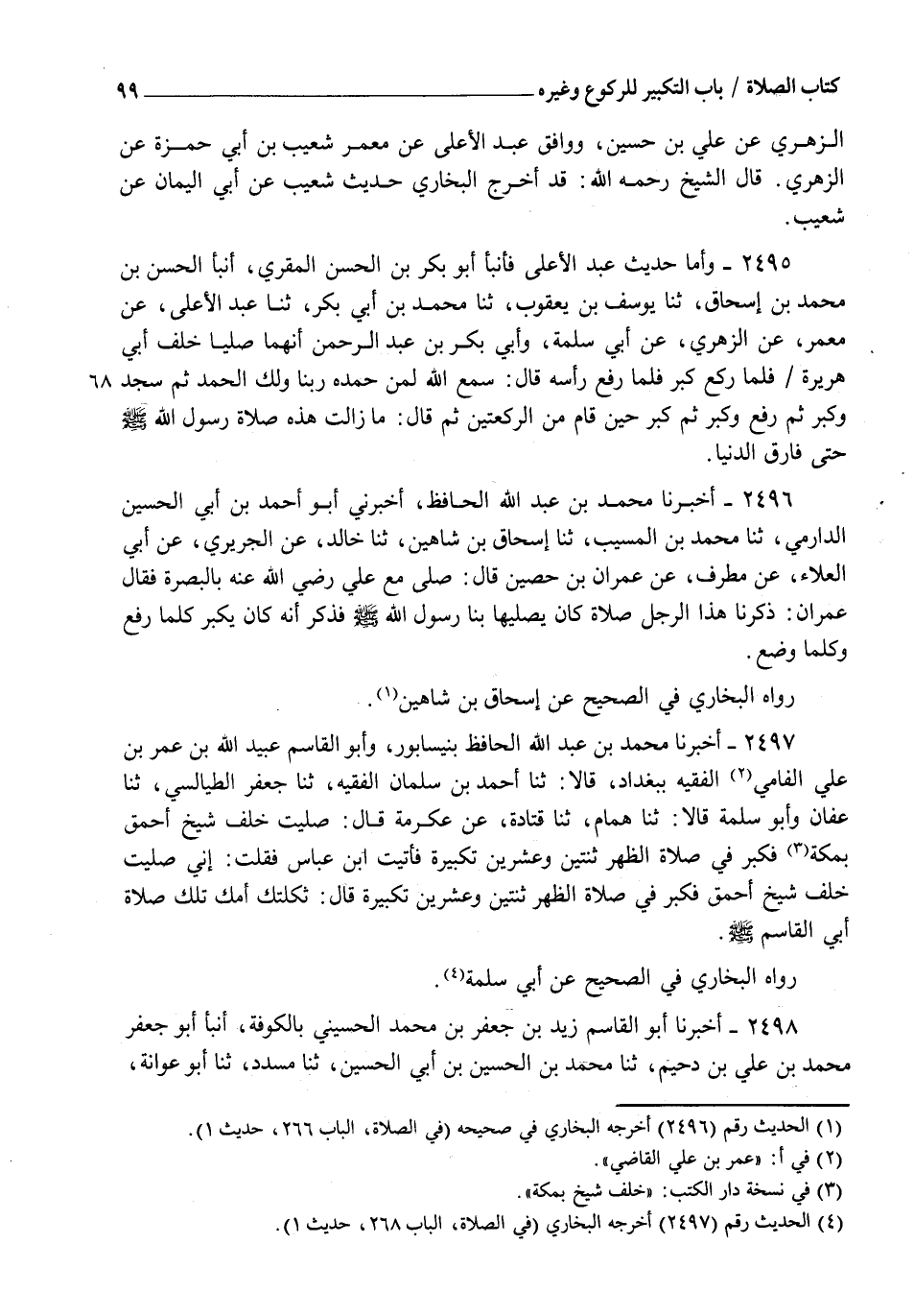 2496 - أَخْبَرَنَا مُحَمَّدُ بْنُ عَبْدِ اللهِ الْحَافِظُ، أَخْبَرَنِي أَبُو أَحْمَدَ بْنُ أَبِي الْحُسَيْنِ الدَّارِمِيُّ، ثنا مُحَمَّدُ بْنُ الْمُسَيَّبِ، ثنا إِسْحَاقُ بْنُ شَاهِينٍ، ثنا خَالِدٌ، عَنِ الْجُرَيْرِيِّ، عَنْ أَبِي الْعَلَاءِ، عَنْ مُطَرِّفٍ، عَنْ عِمْرَانَ بْنِ حُصَيْنٍ قَالَ: " صَلَّى مَعَ عَلِيٍّ رَضِيَ اللهُ عَنْهُ بِالْبَصْرَةِ، فَقَالَ عِمْرَانُ ذَكَّرَنَا هَذَا الرَّجُلُ §صَلَاةً كَانَ يُصَلِّيهَا بِنَا رَسُولُ اللهِ صَلَّى اللهُ عَلَيْهِ وَسَلَّمَ، فَذَكَرَ أَنَّهُ كَانَ يُكَبِّرُ كُلَّمَا رَفَعَ وَكُلَّمَا وَضَعَ " رَوَاهُ الْبُخَارِيُّ فِي الصَّحِيحِ، عَنْ إِسْحَاقَ بْنِ شَاهِينٍ