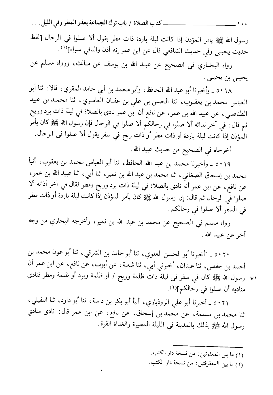 5019 - وَأَخْبَرَنَا مُحَمَّدُ بْنُ عَبْدِ اللهِ الْحَافِظُ، ثنا أَبُو الْعَبَّاسِ مُحَمَّدُ بْنُ يَعْقُوبَ، أنبأ مُحَمَّدُ بْنُ إِسْحَاقَ الصَّغَانِيُّ، ثنا مُحَمَّدُ بْنُ عَبْدِ اللهِ بْنِ نُمَيْرٍ، ثنا أَبِي، ثنا عُبَيْدُ اللهِ بْنُ عُمَرَ، عَنْ نَافِعٍ، عَنِ ابْنِ عُمَرَ أَنَّهُ نَادَى بِالصَّلَاةِ فِي لَيْلَةٍ ذَاتِ بَرْدٍ وَرِيحٍ وَمَطَرٍ، فَقَالَ فِي آخِرِ أَذَانِهِ: أَلَا صَلُّوا فِي الرِّحَالِ، ثُمَّ قَالَ: إِنَّ رَسُولَ اللهِ صَلَّى اللهُ عَلَيْهِ وَسَلَّمَ §كَانَ يَأْمُرُ الْمُؤَذِّنَ إِذَا كَانَتْ لَيْلَةٌ بَارِدَةٌ أَوْ ذَاتُ مَطَرٍ فِي السَّفَرِ: " أَلَا صَلُّوا فِي رِحَالِكُمْ ". رَوَاهُ مُسْلِمٌ فِي الصَّحِيحِ عَنْ مُحَمَّدِ بْنِ عَبْدِ اللهِ بْنِ نُمَيْرٍ. وَأَخْرَجَهُ الْبُخَارِيُّ مِنْ وَجْهٍ آخَرَ عَنْ عُبَيْدِ اللهِ