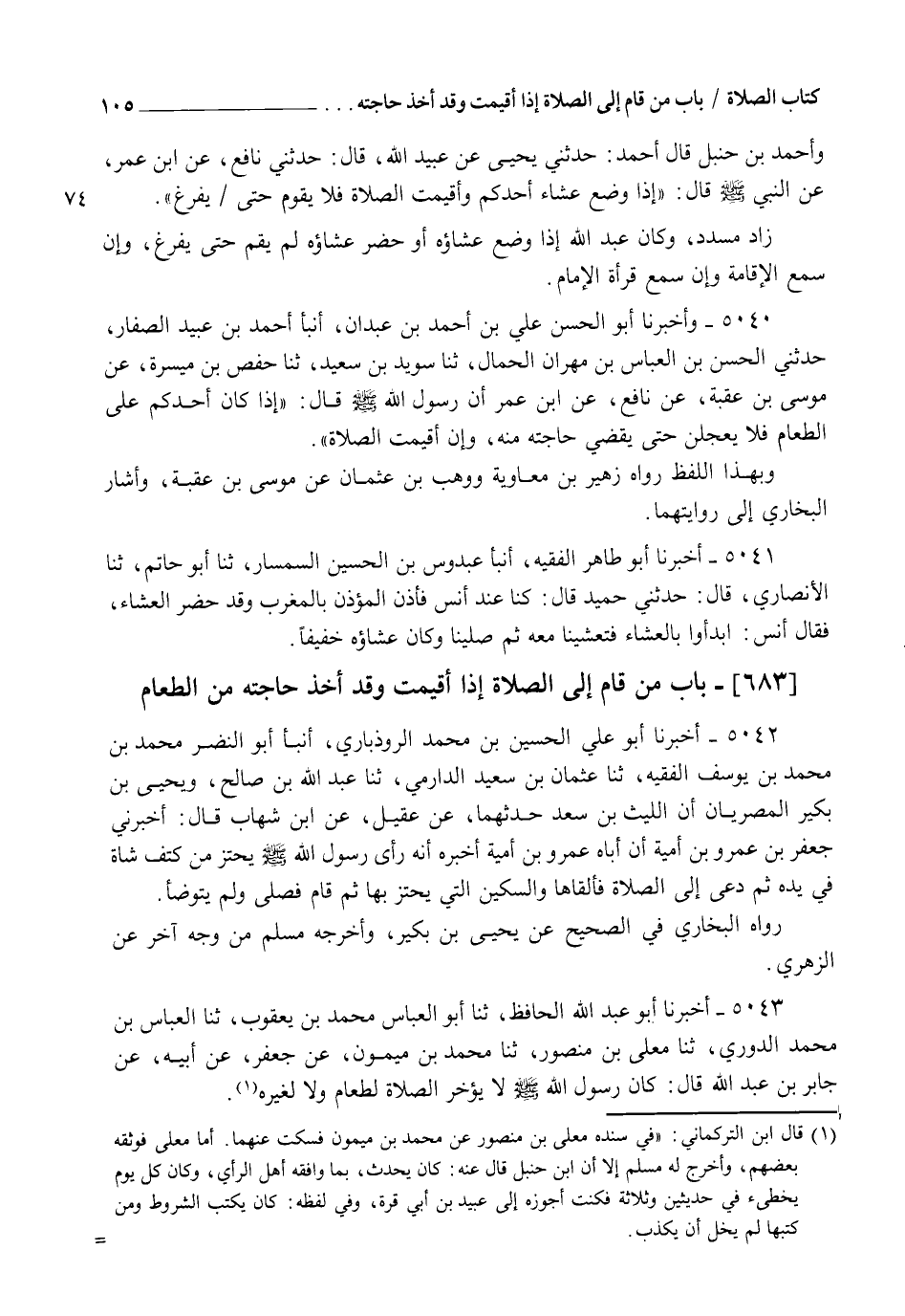 5040 - وَأَخْبَرَنَا أَبُو الْحَسَنِ عَلِيُّ بْنُ أَحْمَدَ بْنِ عَبْدَانَ، أنبأ أَحْمَدُ بْنُ عُبَيْدٍ الصَّفَّارُ، حَدَّثَنِي الْحَسَنُ بْنُ الْعَبَّاسِ بْنِ مِهْرَانَ الْحَمَّالُ، ثنا سُوَيْدُ بْنُ سَعِيدٍ، ثنا حَفْصُ بْنُ مَيْسَرَةَ، عَنْ مُوسَى بْنِ عُقْبَةَ، عَنْ نَافِعٍ، عَنِ ابْنِ عُمَرَ، أَنَّ رَسُولَ اللهِ صَلَّى اللهُ عَلَيْهِ وَسَلَّمَ قَالَ: §" إِذَا كَانَ أَحَدُكُمْ عَلَى الطَّعَامِ فَلَا يَعْجَلَنَّ حَتَّى يَقْضِيَ حَاجَتَهُ مِنْهُ، وَإِنْ أُقِيمَتِ الصَّلَاةُ ". . وَبِهَذَا اللَّفْظِ رَوَاهُ زُهَيْرُ بْنُ مُعَاوِيَةَ، وَوَهْبُ بْنُ عُثْمَانَ، عَنْ مُوسَى بْنِ عُقْبَةَ، وَأَشَارَ الْبُخَارِيُّ إِلَى رِوَايَتِهِمَا