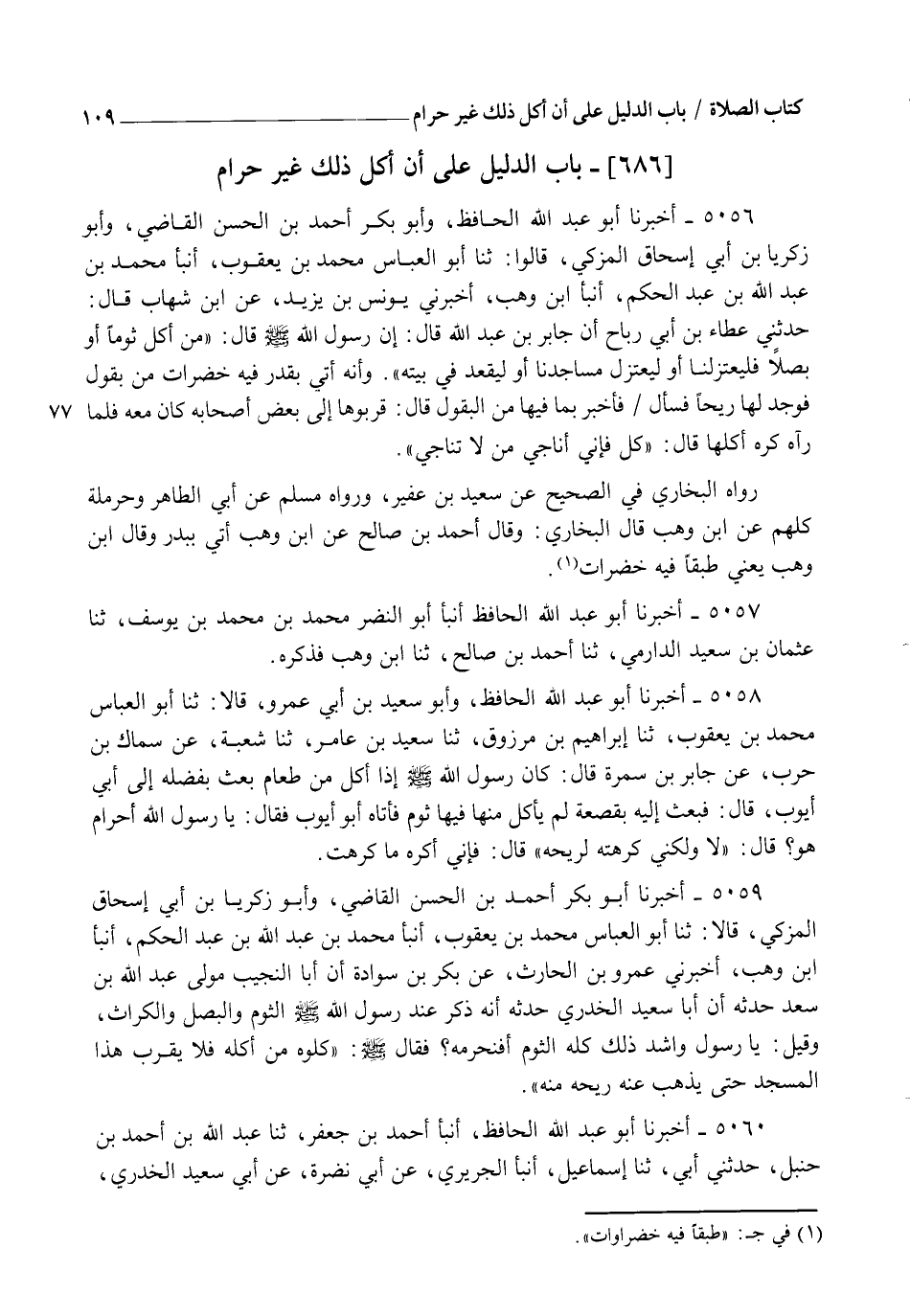 5056 - أَخْبَرَنَا أَبُو عَبْدِ اللهِ الْحَافِظُ، وَأَبُو بَكْرٍ أَحْمَدُ بْنُ الْحَسَنِ الْقَاضِي، وَأَبُو زَكَرِيَّا بْنُ أَبِي إِسْحَاقَ الْمُزَكِّي قَالُوا: ثنا أَبُو الْعَبَّاسِ مُحَمَّدُ بْنُ يَعْقُوبَ، أنبأ مُحَمَّدُ بْنُ عَبْدِ اللهِ بْنِ عَبْدِ الْحَكَمِ، أنبأ ابْنُ وَهْبٍ، أَخْبَرَنِي يُونُسُ بْنُ يَزِيدَ، عَنِ ابْنِ شِهَابٍ قَالَ: حَدَّثَنِي عَطَاءُ بْنُ أَبِي رَبَاحٍ، أَنَّ جَابِرَ بْنَ عَبْدِ اللهِ قَالَ: إِنَّ رَسُولَ اللهِ صَلَّى اللهُ عَلَيْهِ وَسَلَّمَ قَالَ: " §مَنْ أَكَلَ ثُومًا أَوْ بَصَلًا، فَلْيَعْتَزِلْنَا أَوْ لِيَعْتَزِلْ مَسَاجِدَنَا، أَوْ لِيَقْعُدْ فِي بَيْتِهِ "، وَإِنَّهُ أُتِيَ بِقِدْرٍ فِيهِ خَضِرَاتٌ مِنْ بُقُولٍ فَوَجَدَ لَهَا رِيحًا، فَسَأَلَ فَأُخْبِرَ بِمَا فِيهَا مِنَ الْبُقُولِ قَالَ: قَرِّبُوهَا إِلَى بَعْضِ أَصْحَابِهِ كَانَ مَعَهُ فَلَمَّا رَآهُ كَرِهَ أَكْلَهَا قَالَ: " كُلْ فَإِنِّي أُنَاجِي مَنْ لَا تُنَاجِي ". رَوَاهُ الْبُخَارِيُّ فِي الصَّحِيحِ عَنْ سَعِيدِ بْنِ عُفَيْرٍ، وَرَوَاهُ مُسْلِمٌ عَنْ أَبِي الطَّاهِرِ وَحَرْمَلَةَ، كُلُّهُمْ عَنِ ابْنِ وَهْبٍ، قَالَ الْبُخَارِيُّ: وَقَالَ أَحْمَدُ بْنُ صَالِحٍ عَنِ ابْنِ وَهْبٍ: أُتِيَ بِبَدْرٍ، وَقَالَ ابْنُ وَهْبٍ: يَعْنِي طَبَقًا فِيهِ خَضِرَاتٌ.