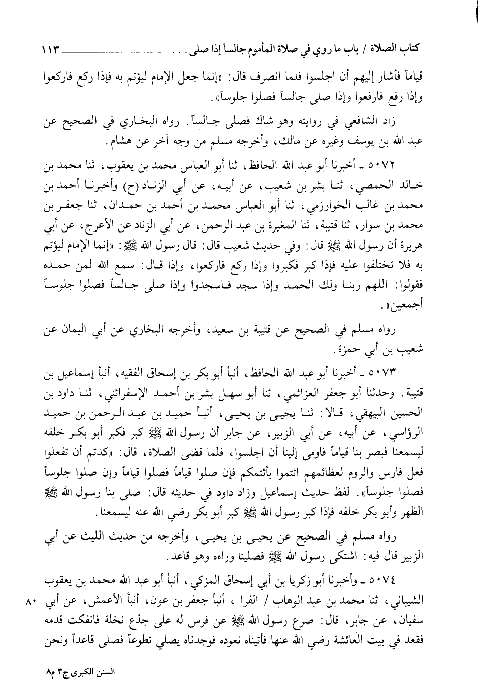 5073 - أَخْبَرَنَا أَبُو عَبْدِ اللهِ الْحَافِظُ، أنبأ أَبُو بَكْرِ بْنُ إِسْحَاقَ الْفَقِيهُ، أنبأ إِسْمَاعِيلُ بْنُ قُتَيْبَةَ، وَحَدَّثَنَا أَبُو جَعْفَرٍ الْعَزَائِمِيُّ، ثنا أَبُو سَهْلٍ بِشْرُ بْنُ أَحْمَدَ الْإِسْفَرَايِينِيُّ، ثنا دَاوُدُ بْنُ الْحُسَيْنِ الْبَيْهَقِيُّ قَالَا: ثنا يَحْيَى بْنُ يَحْيَى، أنبأ حُمَيْدُ بْنُ عَبْدِ الرَّحْمَنِ بْنِ حُمَيْدٍ الرُّؤَاسِيُّ، عَنْ أَبِيهِ، عَنْ أَبِي الزُّبَيْرِ، عَنْ جَابِرٍ، أَنَّ رَسُولَ اللهِ صَلَّى اللهُ عَلَيْهِ وَسَلَّمَ كَبَّرَ فَكَبَّرَ أَبُو بَكْرٍ خَلْفَهُ لِيُسْمِعَنَا، فَبَصُرَ بِنَا قِيَامًا، فَأَوْمَأَ إِلَيْنَا أَنِ اجْلِسُوا، فَلَمَّا قَضَى الصَّلَاةَ قَالَ: " §كِدْتُمْ أَنْ تَفْعَلُوا فِعْلَ فَارِسَ وَالرُّومِ لِعُظَمَائِهِمْ، ائْتَمُّوا بِأَئِمَّتِكُمْ، فَإِنْ صَلُّوا قِيَامًا فَصَلُّوا قِيَامًا، وَإِنْ صَلُّوا جُلُوسًا فَصَلُّوا جُلُوسًا ". لَفْظُ حَدِيثِ إِسْمَاعِيلَ، وَزَادَ دَاوُدُ فِي حَدِيثِهِ قَالَ: صَلَّى بِنَا رَسُولُ اللهِ صَلَّى اللهُ عَلَيْهِ وَسَلَّمَ الظُّهْرَ وَأَبُو بَكْرٍ خَلْفَهُ، فَإِذَا كَبَّرَ رَسُولُ اللهِ صَلَّى اللهُ عَلَيْهِ وَسَلَّمَ كَبَّرَ أَبُو بَكْرٍ رَضِيَ اللهُ عَنْهُ لِيُسْمِعَنَا رَوَاهُ مُسْلِمٌ فِي الصَّحِيحِ، عَنْ يَحْيَى بْنِ يَحْيَى، وَأَخْرَجَهُ مِنْ حَدِيثِ اللَّيْثِ عَنْ أَبِي الزُّبَيْرِ قَالَ فِيهِ: اشْتَكَى رَسُولُ اللهِ صَلَّى اللهُ عَلَيْهِ وَسَلَّمَ فَصَلَّيْنَا وَرَاءَهُ وَهُوَ قَاعِدٌ