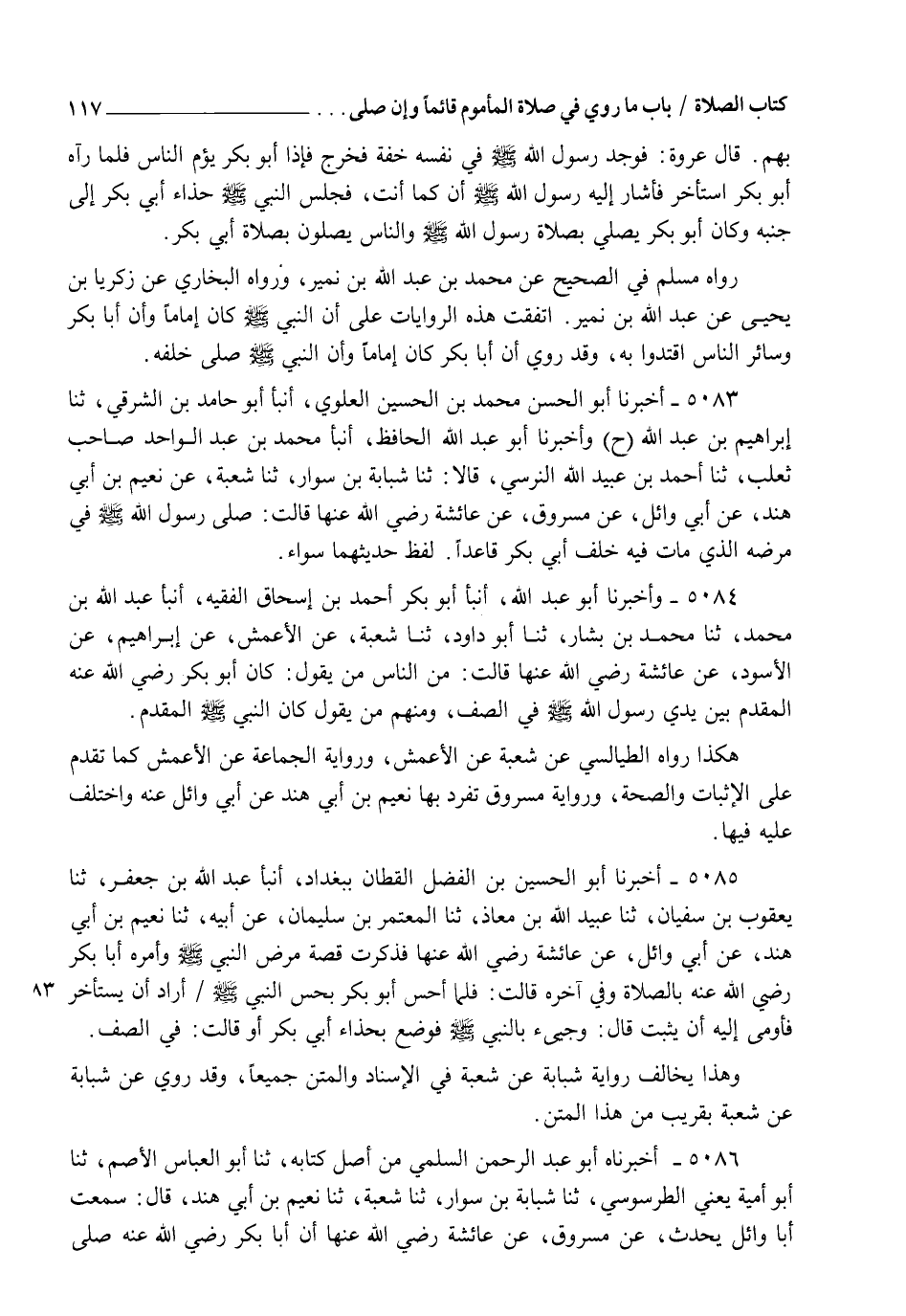 5083 - أَخْبَرَنَا أَبُو الْحَسَنِ مُحَمَّدُ بْنُ الْحُسَيْنِ الْعَلَوِيُّ، أنبأ أَبُو حَامِدِ بْنُ الشَّرْقِيِّ، ثنا إِبْرَاهِيمُ بْنُ عَبْدِ اللهِ، ح وَأَخْبَرَنَا أَبُو عَبْدِ اللهِ الْحَافِظُ، أنبأ مُحَمَّدُ بْنُ عَبْدِ الْوَاحِدِ صَاحِبُ ثَعْلَبٍ، ثنا أَحْمَدُ بْنُ عُبَيْدِ اللهِ النَّرْسِيُّ قَالَا: ثنا شَبَابَةُ بْنُ سَوَّارٍ، ثنا شُعْبَةُ، عَنْ نُعَيْمِ بْنِ أَبِي هِنْدَ، عَنْ أَبِي وَائِلٍ، عَنْ مَسْرُوقٍ، عَنْ عَائِشَةَ رَضِيَ اللهُ عَنْهَا قَالَتْ: §" صَلَّى رَسُولُ اللهِ صَلَّى اللهُ عَلَيْهِ وَسَلَّمَ فِي مَرَضِهِ الَّذِي مَاتَ فِيهِ خَلْفَ أَبِي بَكْرٍ قَاعِدًا ". لَفْظُ حَدِيثِهِمَا سَوَاءٌ