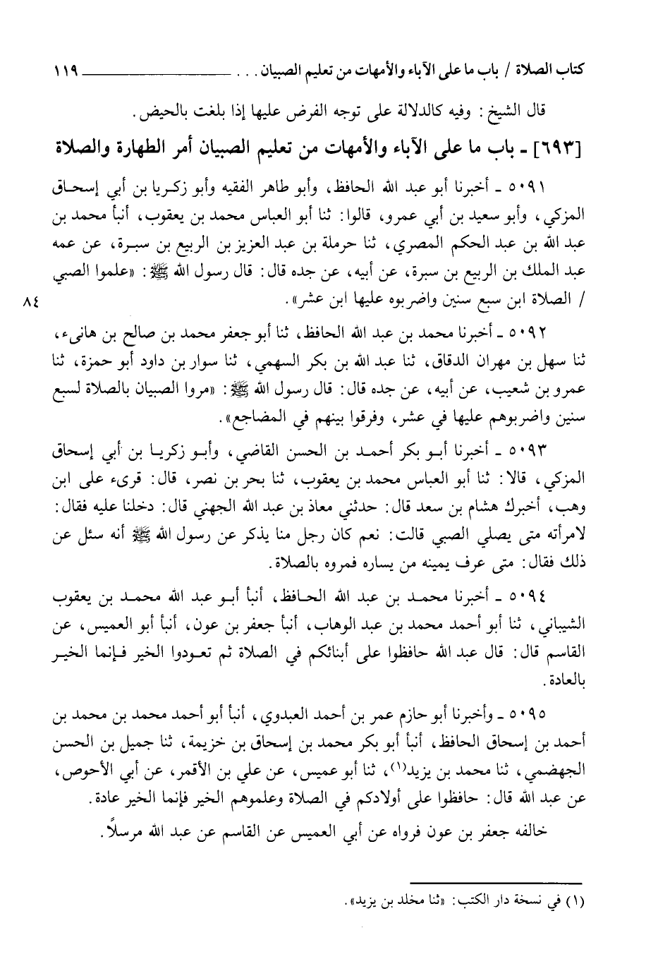 5091 - أَخْبَرَنَا أَبُو عَبْدِ اللهِ الْحَافِظُ، وَأَبُو طَاهِرٍ الْفَقِيهُ، وَأَبُو زَكَرِيَّا بْنُ أَبِي إِسْحَاقَ الْمُزَكِّي، وَأَبُو سَعِيدِ بْنُ أَبِي عَمْرٍو قَالُوا: ثنا أَبُو الْعَبَّاسِ مُحَمَّدُ بْنُ يَعْقُوبَ، أنبأ مُحَمَّدُ بْنُ عَبْدِ اللهِ بْنِ عَبْدِ الْحَكَمِ الْمِصْرِيُّ، ثنا حَرْمَلَةُ بْنُ عَبْدِ الْعَزِيزِ بْنِ الرَّبِيعِ بْنِ سَبْرَةَ، عَنْ عَمِّهِ عَبْدِ الْمَلِكِ بْنِ الرَّبِيعِ بْنِ سَبْرَةَ، عَنْ أَبِيهِ، عَنْ جَدِّهِ قَالَ: قَالَ رَسُولُ اللهِ صَلَّى اللهُ عَلَيْهِ وَسَلَّمَ: " §عَلِّمُوا الصَّبِيَّ الصَّلَاةَ ابْنَ سَبْعِ سِنِينَ، وَاضْرِبُوهُ عَلَيْهَا ابْنَ عَشْرٍ "