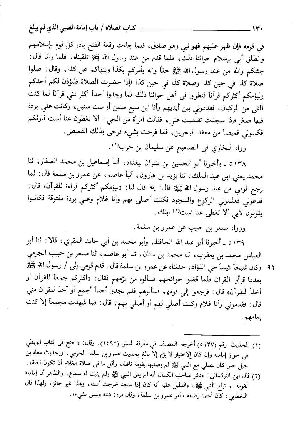 5138 - وَأَخْبَرَنَا أَبُو الْحُسَيْنِ بْنُ بِشْرَانَ بِبَغْدَادَ، أنبأ إِسْمَاعِيلُ بْنُ مُحَمَّدٍ الصَّفَّارُ، ثنا مُحَمَّدٌ يَعْنِي ابْنَ عَبْدِ الْمَلِكِ، ثنا يَزِيدُ بْنُ هَارُونَ، أنبأ عَاصِمٌ، عَنْ عَمْرِو بْنِ سَلَمَةَ قَالَ: لَمَّا رَجَعَ قَوْمِي مِنْ عِنْدِ رَسُولِ اللهِ صَلَّى اللهُ عَلَيْهِ وَسَلَّمَ قَالَ: إِنَّهُ قَالَ لَنَا: " §لِيَؤُمَّكُمْ أَكْثَرُكُمْ قِرَاءَةً لِلْقُرْآنِ ". قَالَ: فَدَعَوْنِي فَعَلَّمُونِي الرُّكُوعَ وَالسُّجُودَ، فَكُنْتُ أُصَلِّي بِهِمْ وَأَنَا غُلَامٌ وَعَلَيَّ بُرْدَةٌ مَفْتُوقَةٌ، فَكَانُوا يَقُولُونَ لِأَبِي: أَلَا تُغَطِّي عَنَّا اسْتَ ابْنِكَ ". وَرَوَاهُ مِسْعَرُ بْنُ حَبِيبٍ، عَنْ عَمْرِو بْنِ سَلَمَةَ