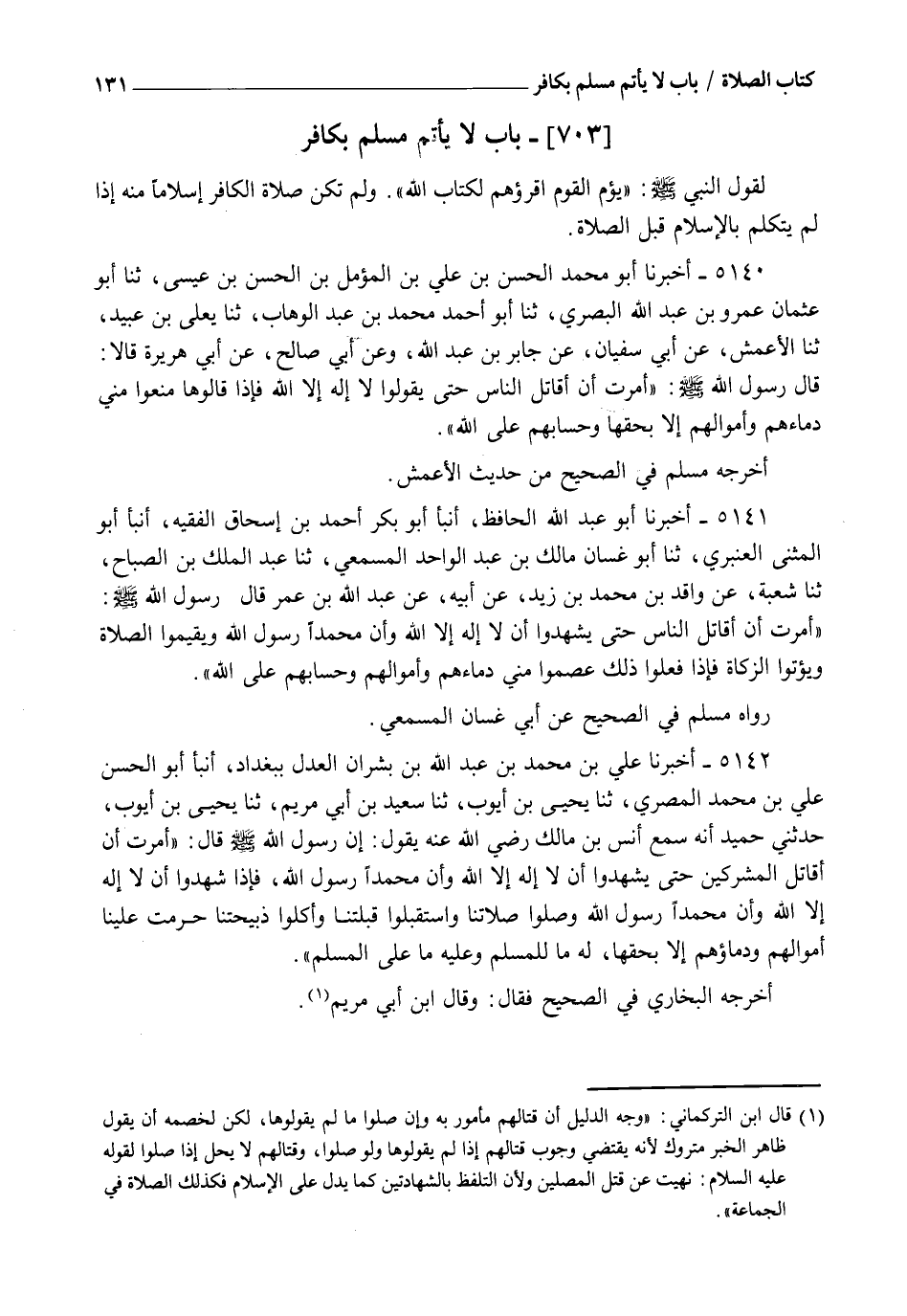 5142 - أَخْبَرَنَا عَلِيُّ بْنُ مُحَمَّدِ بْنِ عَبْدِ اللهِ بْنِ بِشْرَانَ الْعَدْلُ بِبَغْدَادَ، أنبأ أَبُو الْحَسَنِ عَلِيُّ بْنُ مُحَمَّدٍ الْمِصْرِيُّ، ثنا يَحْيَى بْنُ أَيُّوبَ، ثنا سَعِيدُ بْنُ أَبِي مَرْيَمَ، ثنا يَحْيَى بْنُ أَيُّوبَ، حَدَّثَنِي حُمَيْدٌ أَنَّهُ سَمِعَ أَنَسَ بْنَ مَالِكٍ رَضِيَ اللهُ عَنْهُ يَقُولُ: إِنَّ رَسُولَ اللهِ صَلَّى اللهُ عَلَيْهِ وَسَلَّمَ قَالَ: §" أُمِرْتُ أَنْ أُقَاتِلَ الْمُشْرِكِينَ حَتَّى يَشْهَدُوا أَنْ لَا إِلَهَ إِلَّا اللهُ وَأَنَّ مُحَمَّدًا رَسُولُ اللهِ، فَإِذَا شَهِدُوا أَنْ لَا إِلَهَ إِلَّا اللهُ وَأَنَّ مُحَمَّدًا رَسُولُ اللهِ، وَصَلُّوا صَلَاتَنَا، وَاسْتَقْبَلُوا قِبْلَتَنَا، وَأَكَلُوا ذَبِيحَتَنَا، حُرِّمَتْ عَلَيْنَا أَمْوَالُهُمْ وَدِمَاؤُهُمْ إِلَّا بِحَقِّهَا، لَهُ مَا لِلْمُسْلِمِ، وَعَلَيْهِ مَا عَلَى الْمُسْلِمِ ". أَخْرَجَهُ الْبُخَارِيُّ فِي الصَّحِيحِ فَقَالَ: وَقَالَ ابْنُ أَبِي مَرْيَمَ
