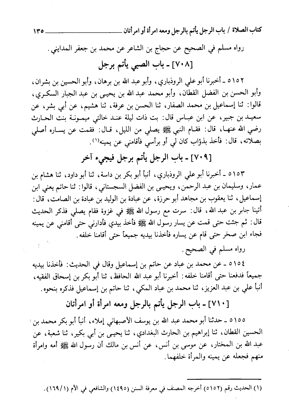 5153 - أَخْبَرَنَا أَبُو عَلِيٍّ الرُّوذْبَارِيُّ، أنبأ أَبُو بَكْرِ بْنُ دَاسَةَ، ثنا أَبُو دَاوُدَ، ثنا هِشَامُ بْنُ عَمَّارٍ، وَسُلَيْمَانُ بْنُ عَبْدِ الرَّحْمَنِ، وَيَحْيَى بْنُ الْفَضْلِ السِّجِسْتَانِيُّ قَالُوا: ثنا حَاتِمٌ يَعْنِي ابْنَ إِسْمَاعِيلَ، ثنا يَعْقُوبُ بْنُ مُجَاهِدٍ أَبُو حَرْزَةَ، عَنْ عُبَادَةَ بْنِ الْوَلِيدِ بْنِ عُبَادَةَ بْنِ الصَّامِتِ قَالَ: أَتَيْنَا جَابِرَ بْنَ عَبْدِ اللهِ قَالَ: " سِرْتُ مَعَ رَسُولِ اللهِ صَلَّى اللهُ عَلَيْهِ وَسَلَّمَ فِي غَزْوَةٍ فَقَامَ يُصَلِّي، فَذَكَرَ الْحَدِيثَ، قَالَ: ثُمَّ جِئْتُ حَتَّى §قُمْتُ عَنْ يَسَارِ رَسُولِ اللهِ صَلَّى اللهُ عَلَيْهِ وَسَلَّمَ فَأَخَذَ بِيَدِي فَأَدَارَنِي حَتَّى أَقَامَنِي عَنْ يَمِينِهِ، فَجَاءَ ابْنُ صَخْرٍ حَتَّى قَامَ عَنْ يَسَارِهِ فَأَخَذَنَا بِيَدَيْهِ جَمِيعًا حَتَّى أَقَامَنَا خَلْفَهُ ". رَوَاهُ مُسْلِمٌ فِي الصَّحِيحِ،