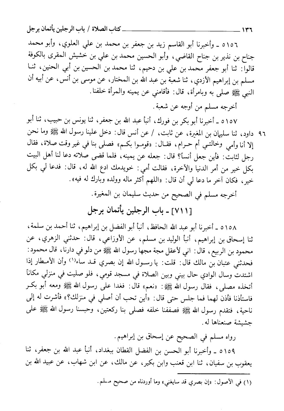 5156 - وَأَخْبَرَنَا أَبُو الْقَاسِمِ زَيْدُ بْنُ جَعْفَرِ بْنِ مُحَمَّدِ بْنِ عَلِيٍّ الْعَلَوِيُّ، وَأَبُو مُحَمَّدٍ جَنَاحُ بْنُ نُذَيْرِ بْنِ جَنَاحٍ الْقَاضِي، وَأَبُو الْحُسَيْنِ مُحَمَّدُ بْنُ عَلِيِّ بْنِ خُشَيْشٍ الْمُقْرِئُ بِالْكُوفَةِ قَالُوا: ثنا أَبُو جَعْفَرٍ مُحَمَّدُ بْنُ عَلِيِّ بْنِ دُحَيْمٍ، ثنا مُحَمَّدُ بْنُ الْحُسَيْنِ بْنِ أَبِي الْحُنَيْنِ، ثنا مُسْلِمُ بْنُ إِبْرَاهِيمَ الْأَزْدِيُّ، ثنا شُعْبَةُ عَنْ عَبْدِ اللهِ بْنِ الْمُخْتَارِ، عَنْ مُوسَى بْنِ أَنَسٍ، عَنْ أَبِيهِ، " أَنَّ النَّبِيَّ صَلَّى اللهُ عَلَيْهِ وَسَلَّمَ §صَلَّى بِهِ وَبِامْرَأَةٍ قَالَ: فَأَقَامَنِي عَنْ يَمِينِهِ، وَالْمَرْأَةَ خَلْفَنَا ". أَخْرَجَهُ مُسْلِمٌ مِنْ أَوْجُهٍ، عَنْ شُعْبَةَ