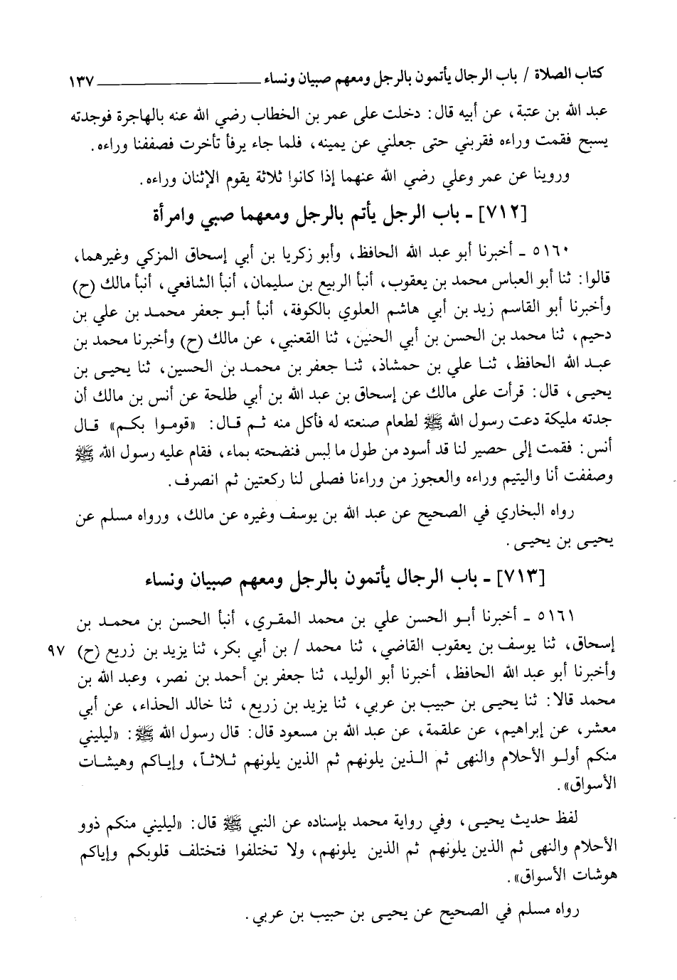 وَفِي رِوَايَةِ مُحَمَّدٍ بِإِسْنَادِهِ، عَنِ النَّبِيِّ صَلَّى اللهُ عَلَيْهِ وَسَلَّمَ قَالَ: " §لِيَلِيَنِي مِنْكُمْ ذَوُو الْأَحْلَامِ وَالنُّهَى، ثُمَّ الَّذِينَ يَلُونَهُمْ، ثُمَّ الَّذِينَ يَلُونَهُمْ، وَلَا تَخْتَلِفُوا فَتَخْتَلِفَ قُلُوبُكُمْ، وَإِيَّاكُمْ هَوْشَاتِ الْأَسْوَاقِ ". رَوَاهُ مُسْلِمٌ فِي الصَّحِيحِ عَنْ يَحْيَى بْنِ حَبِيبِ بْنِ عَرَبِيٍّ