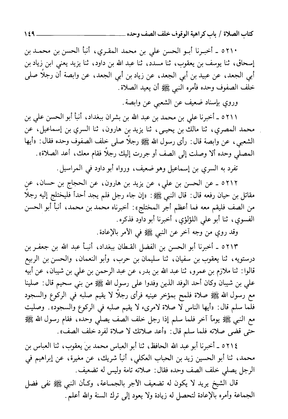 5214 - أَخْبَرَنَا أَبُو عَبْدِ اللهِ الْحَافِظُ، ثنا أَبُو الْعَبَّاسِ مُحَمَّدُ بْنُ يَعْقُوبَ، ثنا الْعَبَّاسُ بْنُ مُحَمَّدٍ، ثنا أَبُو الْحُسَيْنِ زَيْدُ بْنُ الْحُبَابِ الْعُكْلِيُّ، أنبأ شَرِيكٌ، عَنْ مُغِيرَةَ، عَنْ إِبْرَاهِيمَ فِي §الرَّجُلِ يُصَلِّي خَلْفَ الصَّفِّ وَحْدَهُ، فَقَالَ: " صَلَاتُهُ تَامَّةٌ، وَلَيْسَ لَهُ تَضْعِيفٌ ". قَالَ الشَّيْخُ: يُرِيدُ لَا يَكُونُ لَهُ تَضْعِيفُ الْأَجْرِ بِالْجَمَاعَةِ، وَكَأَنَّ النَّبِيَّ صَلَّى اللهُ عَلَيْهِ وَسَلَّمَ نَفَى فَضْلَ الْجَمَاعَةِ، وَأَمَرَهُ بِالْإِعَادَةِ لِتَحْصُلَ لَهُ زِيَادَةٌ وَلَا يَعُودَ إِلَى تَرْكِ السُّنَّةِ، وَاللهُ أَعْلَمُ