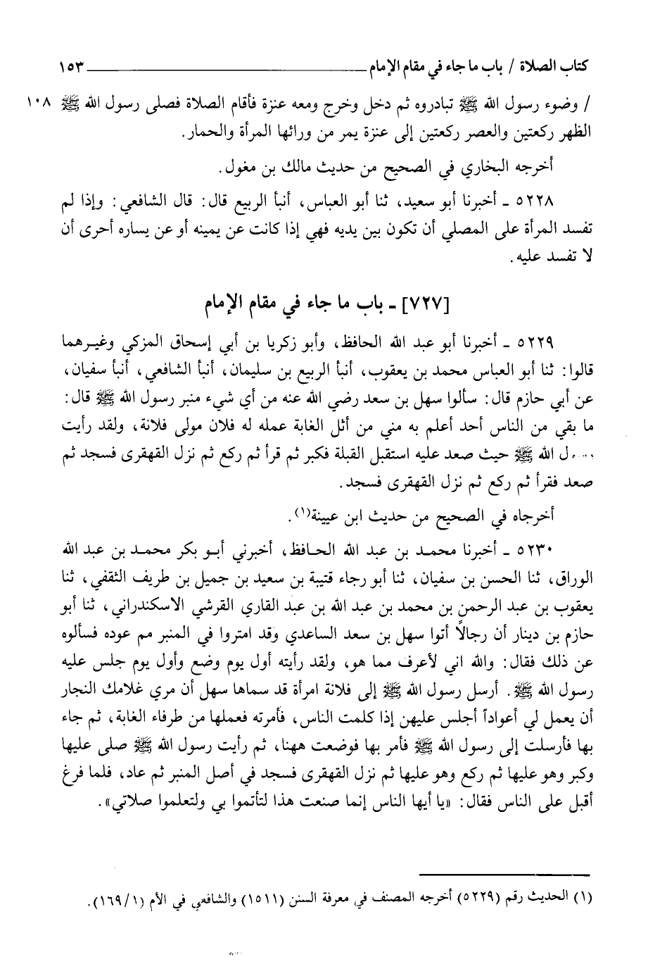 5231 - أَخْبَرَنَا أَبُو عَبْدِ اللهِ الْحَافِظُ، ثنا أَبُو عَبْدِ اللهِ مُحَمَّدُ بْنُ يَعْقُوبَ، ثنا جَعْفَرُ بْنُ مُحَمَّدٍ، وَإِسْمَاعِيلُ بْنُ قُتَيْبَةَ قَالَا: ثنا يَحْيَى بْنُ يَحْيَى، أنبأ عَبْدُ الْعَزِيزِ بْنُ أَبِي حَازِمٍ، عَنْ أَبِيهِ، أَنَّ نَفَرًا جَاءُوا إِلَى سَهْلِ بْنِ سَعْدٍ فَذَكَرَ مَعْنَاهُ. قَالَ الشَّافِعِيُّ فِيمَا أَخْبَرَنَا أَبُو سَعِيدٍ، عَنْ أَبِي الْعَبَّاسِ، عَنِ الرَّبِيعِ عَنْهُ: اخْتَارَ لِلْإِمَامِ الَّذِي يَعْلَمُ مَنْ خَلْفَهُ أَنْ يُصَلِّيَ عَلَى الشَّيْءِ الْمُرْتَفِعِ لِيَرَاهُ مَنْ وَرَاءَهُ، وَإِذَا عَلَمَ النَّاسَ مَرَّةً، أَحْبَبْتُ أَنْ يُصَلِّيَ مُسْتَوِيًا مَعَ الْمَأْمُومِينَ