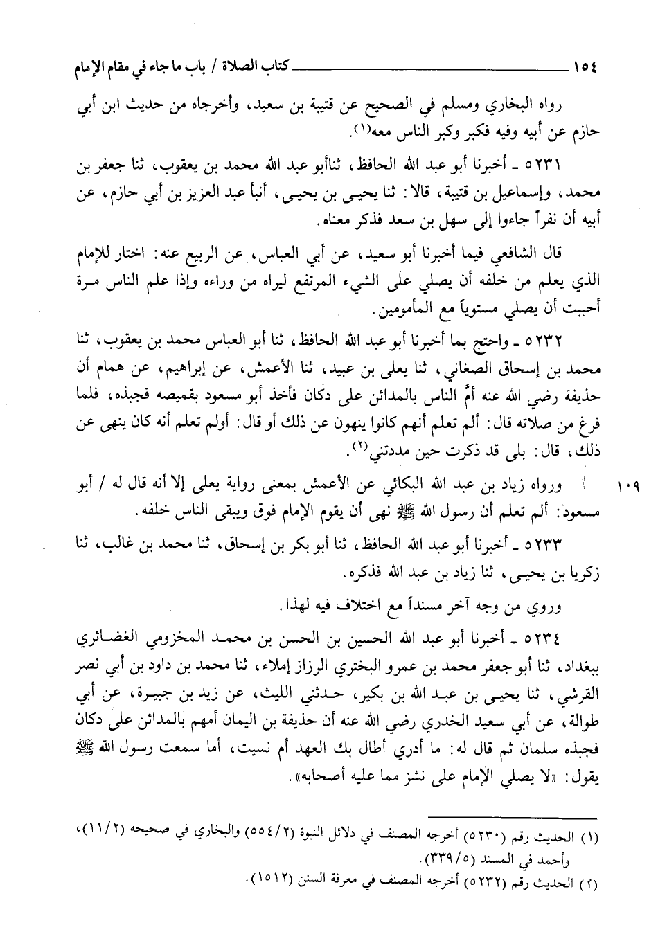 5232 - وَاحْتَجَّ بِمَا أَخْبَرَنَا أَبُو عَبْدِ اللهِ الْحَافِظُ، ثنا أَبُو الْعَبَّاسِ مُحَمَّدُ بْنُ يَعْقُوبَ، ثنا مُحَمَّدُ بْنُ إِسْحَاقَ الصَّغَانِيُّ، ثنا يَعْلَى بْنُ عُبَيْدٍ، ثنا الْأَعْمَشُ، عَنْ إِبْرَاهِيمَ، عَنْ هَمَّامٍ، أَنَّ حُذَيْفَةَ رَضِيَ اللهُ عَنْهُ أَمَّ النَّاسَ بِالْمَدَائِنِ عَلَى دُكَّانٍ، فَأَخَذَ أَبُو مَسْعُودٍ بِقَمِيصِهِ فَجَبَذَهُ، فَلَمَّا فَرَغَ مِنْ صَلَاتِهِ، قَالَ: " §أَلَمْ تَعْلَمْ أَنَّهُمْ كَانُوا يُنْهَوْنَ عَنْ ذَلِكَ، أَوْ قَالَ: أَوْ لَمْ تَعْلَمْ أَنَّهُ كَانَ يُنْهَى عَنْ ذَلِكَ؟ " قَالَ: " بَلَى، قَدْ ذَكَرْتُ حِينَ مَدَدْتَنِي ". وَرَوَاهُ زِيَادُ بْنُ عَبْدِ اللهِ الْبَكَّائِيُّ، عَنِ الْأَعْمَشِ بِمَعْنَى رِوَايَةِ يَعْلَى، إِلَّا أَنَّهُ قَالَ لَهُ أَبُو مَسْعُودٍ: " أَلَمْ تَعْلَمْ أَنَّ رَسُولَ اللهِ صَلَّى اللهُ عَلَيْهِ وَسَلَّمَ نَهَى أَنْ يَقُومَ الْإِمَامُ فَوْقَ، وَيَبْقَى النَّاسُ خَلْفَهُ ".