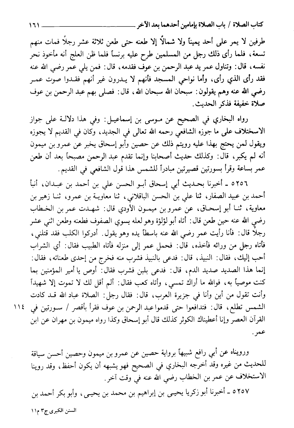 5256 - أَخْبَرَنَا بِحَدِيثِ أَبِي إِسْحَاقَ أَبُو الْحَسَنِ عَلِيُّ بْنُ أَحْمَدَ بْنِ عَبْدَانَ، أنبأ أَحْمَدُ بْنُ عُبَيْدٍ الصَّفَّارُ، ثنا عَلِيُّ بْنُ الْحَسَنِ الْبَاقِلَّانِيُّ، ثنا مُعَاوِيَةُ بْنُ عَمْرٍو، ثنا زُهَيْرُ بْنُ مُعَاوِيَةَ، ثنا أَبُو إِسْحَاقَ، عَنْ عَمْرِو بْنِ مَيْمُونٍ الْأَوْدِيِّ قَالَ: §شَهِدْتُ عُمَرَ بْنَ الْخَطَّابِ رَضِيَ اللهُ عَنْهُ حِينَ طُعِنَ، قَالَ: أَتَاهُ أَبُو لُؤْلُؤَةَ وَهُوَ لَعَلَّهُ يُسَوِّي الصُّفُوفَ فَطَعَنَهُ وَطَعَنَ اثْنَيْ عَشَرَ رَجُلًا، قَالَ: فَأَنَا رَأَيْتُ عُمَرَ رَضِيَ اللهُ عَنْهُ بَاسِطًا يَدَهُ وَهُوَ يَقُولُ: " أَدْرِكُوا الْكَلْبَ فَقَدْ قَتَلَنِي"، فَأَتَاهُ رَجُلٌ مِنْ وَرَائِهِ فَأَخَذَهُ. قَالَ: فَحُمِلَ عُمَرُ إِلَى مَنْزِلِهِ فَأَتَاهُ الطَّبِيبُ فَقَالَ: أِيُّ الشَّرَابِ أَحَبُّ إِلَيْكَ؟ فَقَالَ: النَّبِيذُ. قَالَ: فَدُعِيَ بِالنَّبِيذِ فَشَرِبَ مِنْهُ فَخَرَجَ مِنْ إِحْدَى طَعَنَاتِهِ، فَقَالَ: إِنَّمَا هَذَا الصَّدِيدُ صَدِيدُ الدَّمِ، قَالَ: فَدُعِيَ بِلَبَنٍ فَشَرِبَ فَقَالَ: أَوْصِ يَا أَمِيرَ الْمُؤْمِنِينَ بِمَا كُنْتَ مُوصِيًا بِهِ، فَوَاللهِ مَا أَرَاكَ تُمْسِي، وَأَتَاهُ كَعْبٌ فَقَالَ: أَلَمْ أَقُلْ لَكَ لَا تَمُوتُ إِلَّا شَهِيدًا، وَأَنْتَ تَقُولُ: مِنْ أَيْنَ وَأَنَا فِي جَزِيرَةِ الْعَرَبِ؟ قَالَ: فَقَالَ رَجُلٌ: الصَّلَاةَ عِبَادَ اللهِ، قَدْ كَادَتِ الشَّمْسُ تَطْلُعُ، قَالَ: فَتَدَافَعُوا حَتَّى قَدَّمُوا عَبْدَ الرَّحْمَنِ بْنَ عَوْفٍ فَقَرَأَ بِأَقْصَرِ سُورَتَيْنِ فِي الْقُرْآنِ، الْعَصْرِ، وَإِنَّا أَعْطَيْنَاكَ الْكَوْثَرَ". كَذَلِكَ قَالَ أَبُو إِسْحَاقَ، وَكَذَا رَوَاهُ مَيْمُونُ بْنُ مِهْرَانَ، عَنِ ابْنِ عُمَرَ وَرُوِّينَاهُ عَنْ أَبِي رَافِعٍ شَبِيهًا بِرِوَايَةِ حُصَيْنٍ عَنْ عَمْرِو بْنِ مَيْمُونٍ، وَحُصَيْنٌ أَحْسَنُ سِيَاقَةً لِلْحَدِيثِ مِنْ غَيْرِهِ، وَقَدْ أَخْرَجَهُ الْبُخَارِيُّ فِي الصَّحِيحِ فَهُوَ يُشْبِهُهُ أَنْ يَكُونَ أَحْفَظَ وَقَدْ رُوِّينَا الِاسْتِخْلَافَ عَنْ عُمَرَ بْنِ الْخَطَّابِ رَضِيَ اللهُ عَنْهُ فِي وَقْتٍ آخَرَ