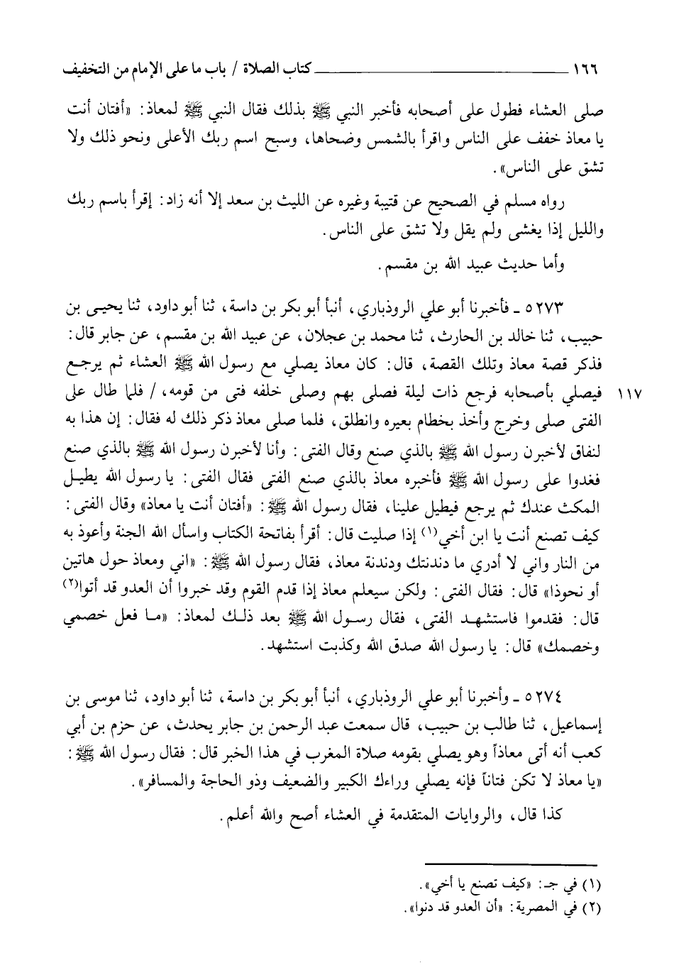 5273 - فَأَخْبَرَنَا أَبُو عَلِيٍّ الرُّوذْبَارِيُّ، أنبأ أَبُو بَكْرِ بْنُ دَاسَةَ، ثنا أَبُو دَاوُدَ، ثنا يَحْيَى بْنُ حَبِيبٍ، ثنا خَالِدُ بْنُ الْحَارِثِ، ثنا مُحَمَّدُ بْنُ عَجْلَانَ، عَنْ عُبَيْدِ اللهِ بْنِ مِقْسَمٍ، عَنْ جَابِرٍ، قَالَ، فَذَكَرَ قِصَّةَ مُعَاذٍ وَتِلْكَ الْقِصَّةَ قَالَ: كَانَ مُعَاذٌ يُصَلِّي مَعَ رَسُولِ اللهِ صَلَّى اللهُ عَلَيْهِ وَسَلَّمَ الْعِشَاءَ، ثُمَّ يَرْجِعُ فَيُصَلِّي بِأَصْحَابِهِ فَرَجَعَ ذَاتَ لَيْلَةٍ فَصَلَّى بِهِمْ، وَصَلَّى خَلْفَهُ فَتًى مِنْ قَوْمِهِ، فَلَمَّا طَالَ عَلَى الْفَتَى صَلَّى وَخَرَجَ وَأَخَذَ بِخِطَامِ بَعِيرِهِ وَانْطَلَقَ، فَلَمَّا صَلَّى مُعَاذٌ ذُكِرَ ذَلِكَ لَهُ فَقَالَ: إِنَّ هَذَا بِهِ لَنِفَاقٌ لَأُخْبِرَنَّ رَسُولَ اللهِ صَلَّى اللهُ عَلَيْهِ وَسَلَّمَ بِالَّذِي صَنَعَ، وَقَالَ الْفَتَى: وَأَنَا لَأُخْبِرَنَّ رَسُولَ اللهِ صَلَّى اللهُ عَلَيْهِ وَسَلَّمَ بِالَّذِي صَنَعَ، فَغَدَوْا عَلَى رَسُولِ اللهِ صَلَّى اللهُ عَلَيْهِ وَسَلَّمَ فَأَخْبَرَهُ مُعَاذٌ بِالَّذِي صَنَعَ الْفَتَى، فَقَالَ الْفَتَى: يَا رَسُولَ اللهِ يُطِيلُ الْمُكْثَ عِنْدَكَ، ثُمَّ يَرْجِعُ فَيُطِيلُ عَلَيْنَا. فَقَالَ رَسُولُ اللهِ صَلَّى اللهُ عَلَيْهِ وَسَلَّمَ: " §أَفَتَّانٌ أَنْتَ يَا مُعَاذُ؟ "، وَقَالَ للْفَتَى: " كَيْفَ تَصْنَعُ أَنْتَ يَا ابْنَ أَخِي إِذَا صَلَّيْتَ؟ " قَالَ: أَقْرَأُ بِفَاتِحَةِ الْكِتَابِ وَأَسْأَلُ اللهَ الْجَنَّةَ وَأَعُوذُ بِهِ مِنَ النَّارِ، وَأَنِّي لَا أَدْرِي مَا دَنْدَنَتُكَ وَدَنْدَنَةُ مُعَاذٍ، فَقَالَ رَسُولُ اللهِ صَلَّى اللهُ عَلَيْهِ وَسَلَّمَ: " إِنِّي وَمُعَاذٌ حَوْلَ هَاتَيْنِ، أَوْ نَحْوَ ذَا " قَالَ: فَقَالَ الْفَتَى: وَلَكِنْ سَيَعْلَمُ مُعَاذٌ إِذَا قَدِمَ الْقَوْمُ وَقَدْ خُبِّرُوا أَنَّ الْعَدُوَّ قَدْ أَتَوْا، قَالَ: فَقَدِمُوا، فَاسْتُشْهِدَ الْفَتَى. فَقَالَ رَسُولُ اللهِ صَلَّى اللهُ عَلَيْهِ وَسَلَّمَ بَعْدَ ذَلِكَ لِمُعَاذٍ: " مَا فَعَلَ خَصْمِي وَخَصْمُكَ؟ " قَالَ: يَا رَسُولَ اللهِ، صَدَقَ اللهَ، وَكَذَبْتُ، اسْتُشْهِدَ