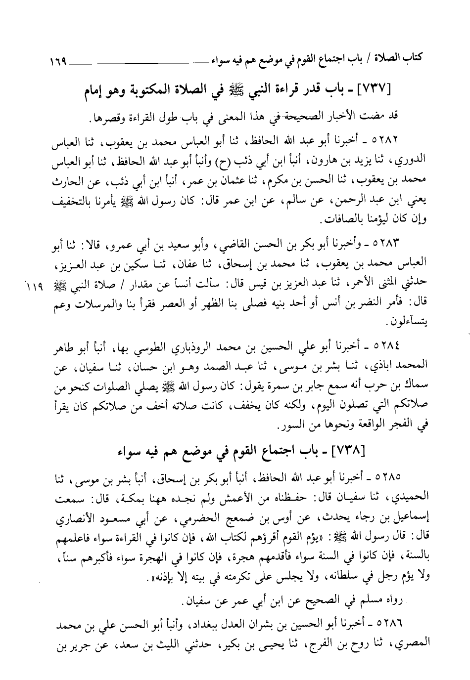 5285 - أَخْبَرَنَا أَبُو عَبْدِ اللهِ الْحَافِظُ، أنبأ أَبُو بَكْرِ بْنُ إِسْحَاقَ، أنبأ بِشْرُ بْنُ مُوسَى، ثنا الْحُمَيْدِيُّ، ثنا سُفْيَانُ قَالَ: حَفِظْنَاهُ مِنَ الْأَعْمَشِ وَلَمْ نَجِدْهُ هَهُنَا بِمَكَّةَ قَالَ: سَمِعْتُ إِسْمَاعِيلَ بْنَ رَجَاءٍ، يُحَدِّثُ عَنْ أَوْسِ بْنِ ضَمْعَجٍ الْحَضْرَمِيِّ، عَنْ أَبِي مَسْعُودٍ الْأَنْصَارِيِّ قَالَ: قَالَ رَسُولُ اللهِ صَلَّى اللهُ عَلَيْهِ وَسَلَّمَ: §" يَؤُمُّ الْقَوْمَ أَقْرَؤُهُمْ لِكِتَابِ اللهِ فَإِنْ كَانُوا فِي الْقِرَاءَةِ سَوَاءً، فَأَعْلَمُهُمْ بِالسُّنَّةِ، فَإِنْ كَانُوا فِي السُّنَّةِ سَوَاءً فَأَقْدَمُهُمْ هِجْرَةً، فَإِنْ كَانُوا فِي الْهِجْرَةِ سَوَاءً فَأَكْبَرُهُمْ سِنًّا، وَلَا يُؤَمُّ رَجُلٌ فِي سُلْطَانِهِ، وَلَا يُجْلَسُ عَلَى تَكْرِمَتِهِ فِي بَيْتِهِ إِلَّا بِإِذْنِهِ ". رَوَاهُ مُسْلِمٌ فِي الصَّحِيحِ عَنِ ابْنِ أَبِي عُمَرَ عَنْ سُفْيَانَ