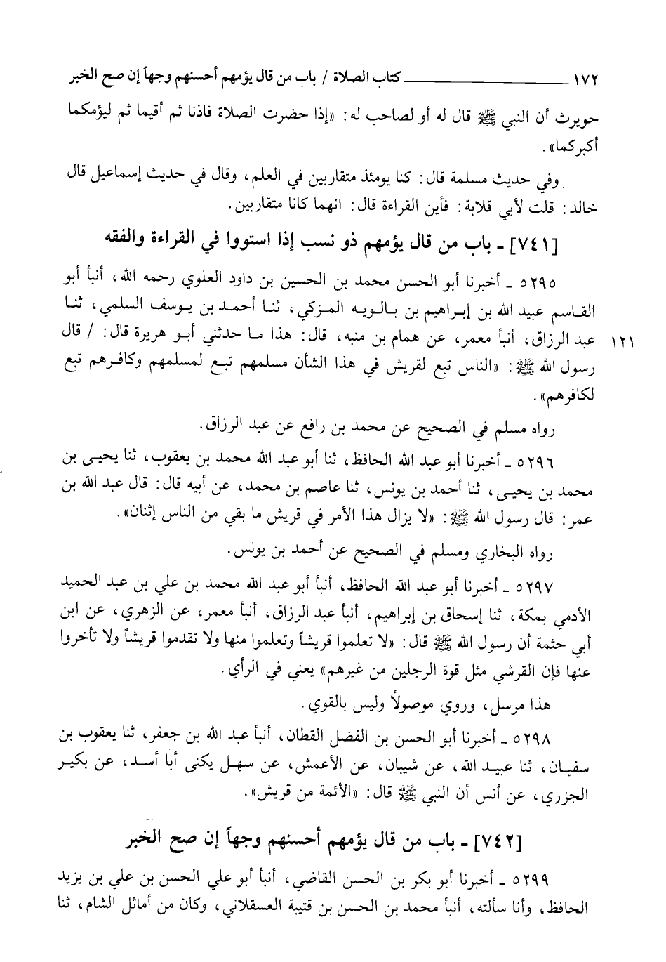 5295 - أَخْبَرَنَا أَبُو الْحَسَنِ مُحَمَّدُ بْنُ الْحُسَيْنِ بْنِ دَاوُدَ الْعَلَوِيُّ رَحِمَهُ اللهُ، أنبأ أَبُو الْقَاسِمِ عُبَيْدُ اللهِ بْنُ إِبْرَاهِيمَ بْنِ بَالَوَيْهِ الْمُزَكِّي، ثنا أَحْمَدُ بْنُ يُوسُفَ السُّلَمِيُّ، ثنا عَبْدُ الرَّزَّاقِ، أنبأ مَعْمَرٌ، عَنْ هَمَّامِ بْنِ مُنَبِّهٍ قَالَ: هَذَا مَا حَدَّثَنِي أَبُو هُرَيْرَةَ قَالَ: قَالَ رَسُولُ اللهِ صَلَّى اللهُ عَلَيْهِ وَسَلَّمَ: " §النَّاسُ تَبَعٌ لِقُرَيْشٍ فِي هَذَا الشَّأْنِ، مُسْلِمُهُمْ تَبَعٌ لِمُسْلِمِهِمْ، وَكَافِرُهُمْ تَبَعٌ لِكَافِرِهِمْ ". رَوَاهُ مُسْلِمٌ فِي الصَّحِيحِ عَنْ مُحَمَّدِ بْنِ رَافِعٍ عَنْ عَبْدِ الرَّزَّاقِ