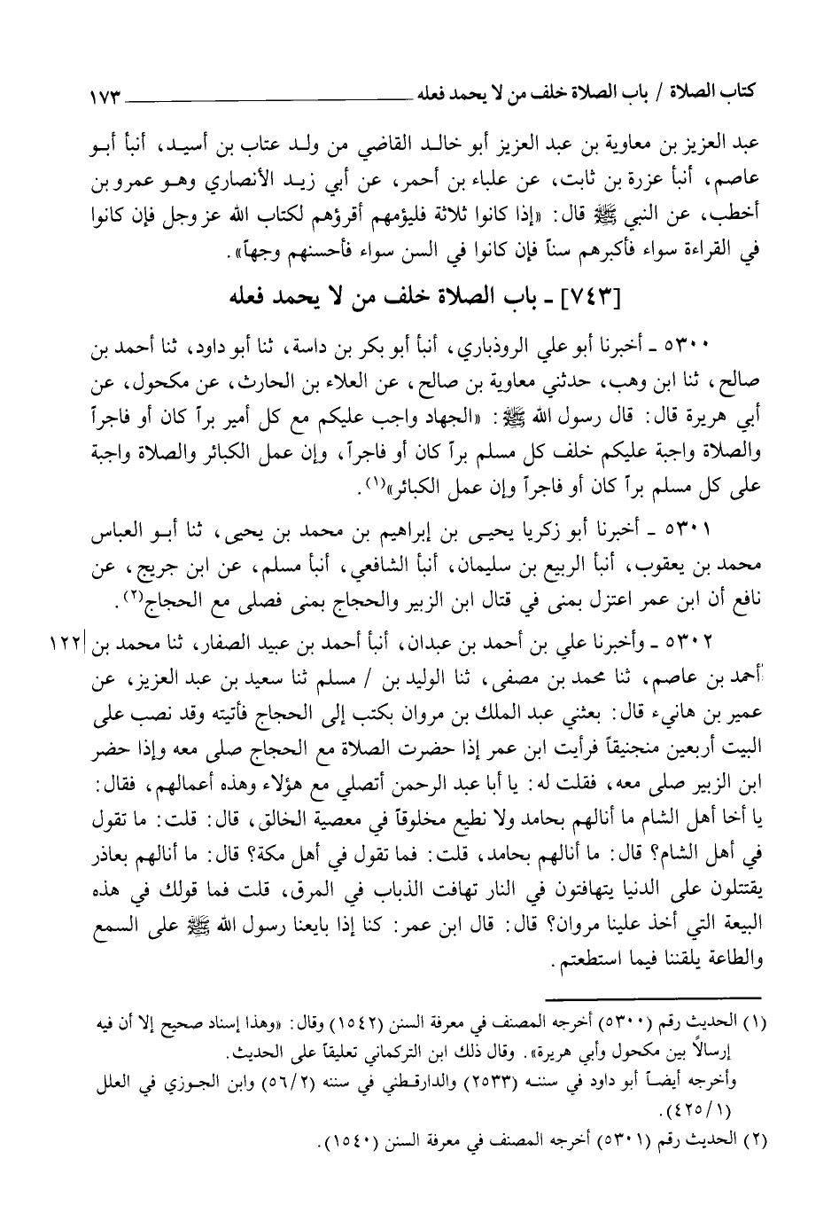 5300 - أَخْبَرَنَا أَبُو عَلِيٍّ الرُّوذْبَارِيُّ، أنبأ أَبُو بَكْرِ بْنُ دَاسَةَ، ثنا أَبُو دَاوُدَ، ثنا أَحْمَدُ بْنُ صَالِحٍ، ثنا ابْنُ وَهْبٍ، حَدَّثَنِي مُعَاوِيَةُ بْنُ صَالِحٍ، عَنِ الْعَلَاءِ بْنِ الْحَارِثِ، عَنْ مَكْحُولٍ، عَنْ أَبِي هُرَيْرَةَ قَالَ: قَالَ رَسُولُ اللهِ صَلَّى اللهُ عَلَيْهِ وَسَلَّمَ: " §الْجِهَادُ وَاجِبٌ عَلَيْكُمْ مَعَ كُلِّ أَمِيرٍ، بَرًّا كَانَ أَوْ فَاجِرًا، وَالصَّلَاةُ وَاجِبَةٌ عَلَيكُمْ خَلْفَ كُلِّ مُسْلِمٍ بَرًّا كَانَ أَوْ فَاجِرًا، وَإِنْ عَمِلَ الْكَبَائِرَ، وَالصَّلَاةُ وَاجِبَةٌ عَلَى كُلِّ مُسْلِمٍ بَرًّا كَانَ أَوْ فَاجِرًا وَإِنْ عَمِلَ الْكَبَائِرَ "