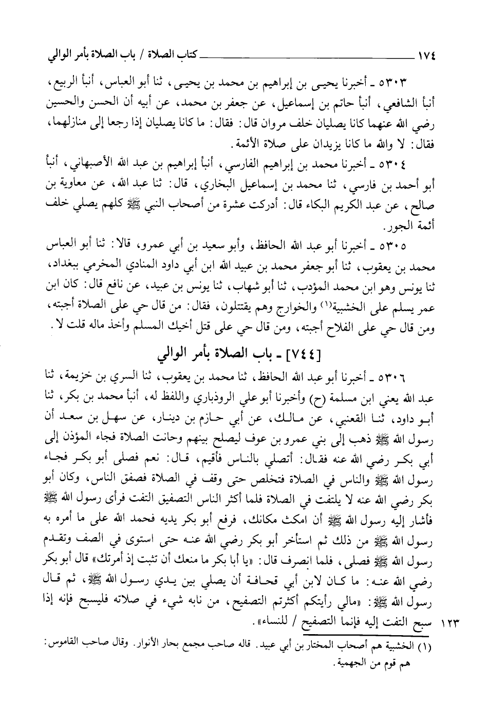 5304 - أَخْبَرَنَا مُحَمَّدُ بْنُ إِبْرَاهِيمَ الْفَارِسِيُّ، أنبأ إِبْرَاهِيمُ بْنُ عَبْدِ اللهِ الْأَصْبَهَانِيُّ، أنبأ أَبُو أَحْمَدَ بْنُ فَارِسٍ، ثنا مُحَمَّدُ بْنُ إِسْمَاعِيلَ الْبُخَارِيُّ قَالَ: ثنا عَبْدُ اللهِ، عَنْ مُعَاوِيَةَ بْنِ صَالِحٍ، عَنْ عَبْدِ الْكَرِيمِ الْبَكَّاءِ قَالَ: " §أَدْرَكْتُ عَشَرَةً مِنْ أَصْحَابِ النَّبِيِّ صَلَّى اللهُ عَلَيْهِ وَسَلَّمَ، كُلُّهُمْ يُصَلِّي خَلْفَ أَئِمَّةِ الْجَوْرِ "