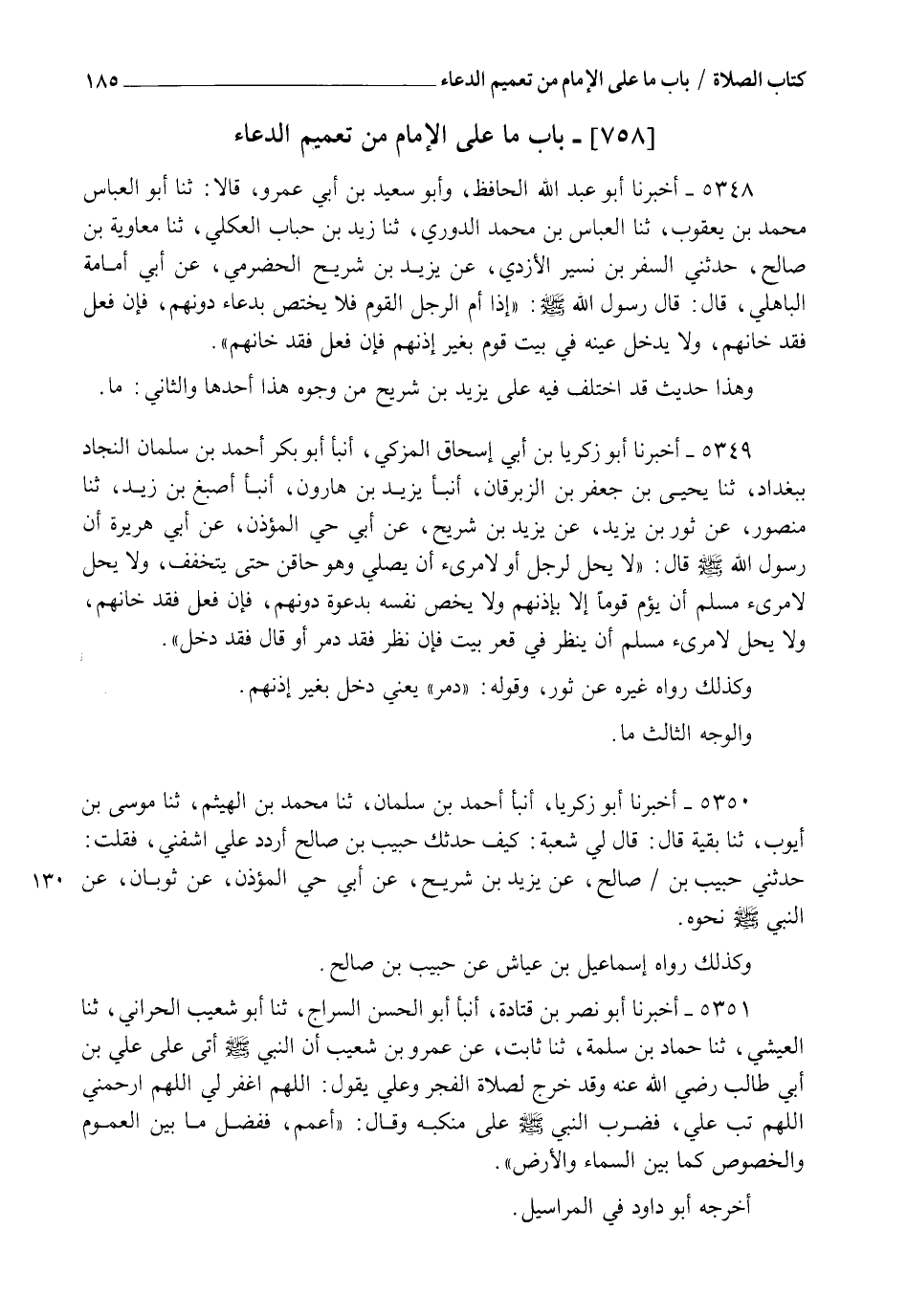 5348 - أَخْبَرَنَا أَبُو عَبْدُ اللهِ الْحَافِظُ، وَأَبُو سَعِيدِ بْنُ أَبِي عَمْرٍو قَالَا: ثنا أَبُو الْعَبَّاسِ مُحَمَّدُ بْنُ يَعْقُوبَ، ثنا الْعَبَّاسُ بْنُ مُحَمَّدٍ الدُّورِيُّ، ثنا زَيْدُ بْنُ حُبَابٍ الْعُكْلِيُّ، ثنا مُعَاوِيَةُ بْنُ صَالِحٍ، حَدَّثَنِي السَّفَرُ بْنُ نُسَيْرٍ الْأَزْدِيُّ، عَنْ يَزِيدَ بْنِ شُرَيْحٍ الْحَضْرَمِيِّ، عَنْ أَبِي أُمَامَةَ الْبَاهِلِيِّ قَالَ: قَالَ رَسُولُ اللهِ صَلَّى اللهُ عَلَيْهِ وَسَلَّمَ: " §إِذَا أَمَّ الرَّجُلُ الْقَوْمَ فَلَا يَخْتَصَّ بِدُعَاءٍ دُونَهُمْ، فَإِنْ فَعَلَ فَقَدْ خَانَهُمْ، وَلَا يُدْخِلُ عَيْنَهُ فِي بَيْتِ قَوْمٍ بِغَيْرِ إِذْنِهِمْ فَإِنْ فَعَلَ فَقَدْ خَانَهُمْ ". وَهَذَا حَدِيثٌ قَدِ اخْتُلِفَ فِيهِ عَلَى يَزِيدَ بْنِ شُرَيْحٍ، مِنْ وُجُوهٍ هَذَا أَحَدُهَا، وَالثَّانِي