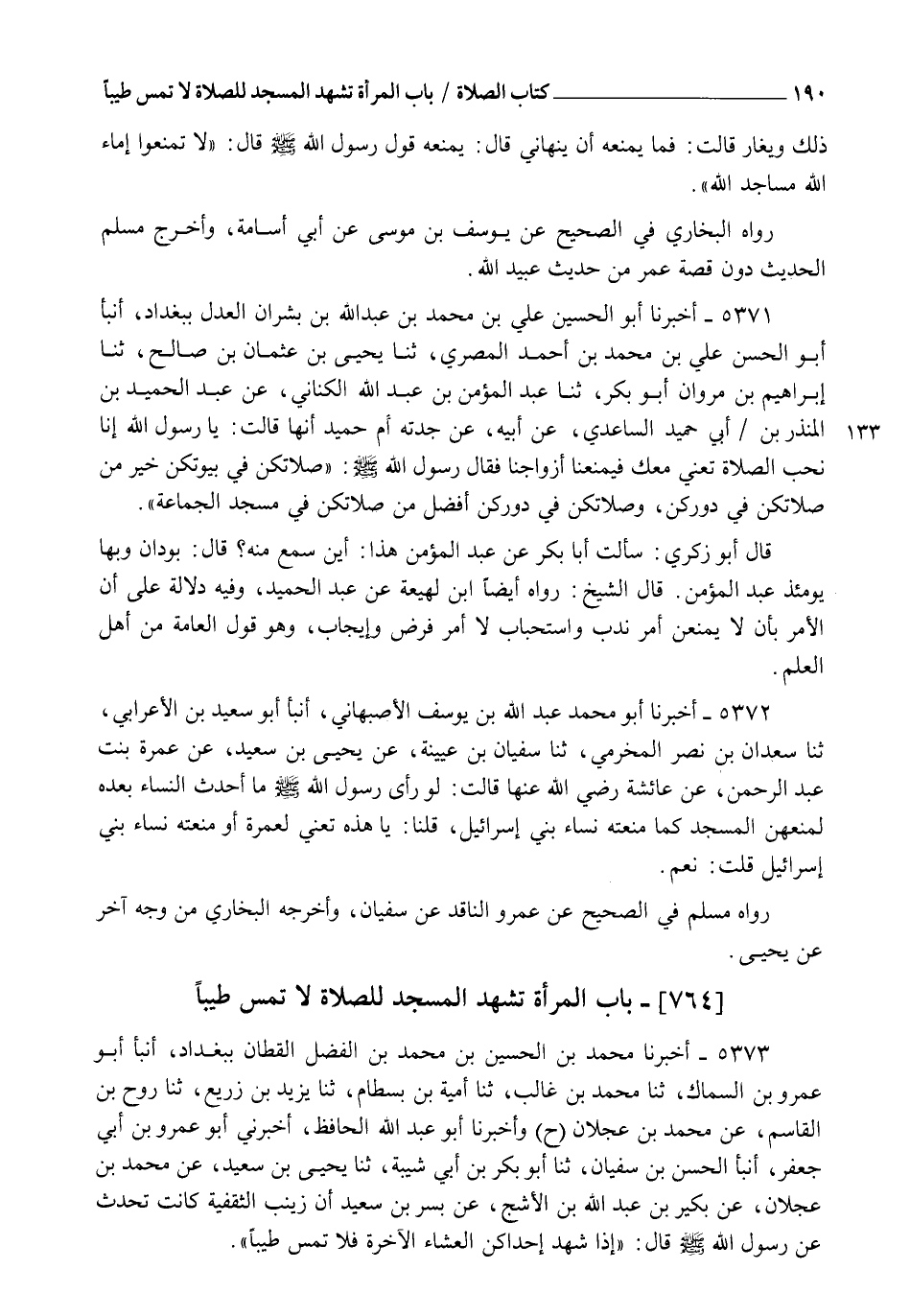 5372 - أَخْبَرَنَا أَبُو مُحَمَّدٍ عَبْدُ اللهِ بْنُ يُوسُفَ الْأَصْبَهَانِيُّ، أنبأ أَبُو سَعِيدِ بْنُ الْأَعْرَابِيِّ، ثنا سَعْدَانُ بْنُ نَصْرٍ الْمَخْرَمِيُّ، ثنا سُفْيَانُ بْنُ عُيَيْنَةَ، عَنْ يَحْيَى بْنِ سَعِيدٍ، عَنْ عَمْرَةَ بِنْتِ عَبْدِ الرَّحْمَنِ، عَنْ عَائِشَةَ رَضِيَ اللهُ عَنْهَا قَالَتْ: §" لَوْ رَأَى رَسُولُ اللهِ صَلَّى اللهُ عَلَيْهِ وَسَلَّمَ مَا أَحْدَثَ النِّسَاءُ بَعْدَهُ لَمَنَعَهُنَّ الْمَسْجِدَ كَمَا مُنِعَتْهُ نِسَاءُ بَنِي إِسْرَائِيلَ ". قُلْنَا: يَا هَذِهِ، تَعْنِي لِعَمْرَةَ، أَوَمُنِعَتْهُ نِسَاءُ بَنِي إِسْرَائِيلَ؟ قُلْتُ: نَعَمْ ". رَوَاهُ مُسْلِمٌ فِي الصَّحِيحِ عَنْ عَمْرٍو النَّاقِدِ عَنْ سُفْيَانَ، وَأَخْرَجَهُ الْبُخَارِيُّ مِنْ وَجْهٍ آخَرَ عَنْ يَحْيَى