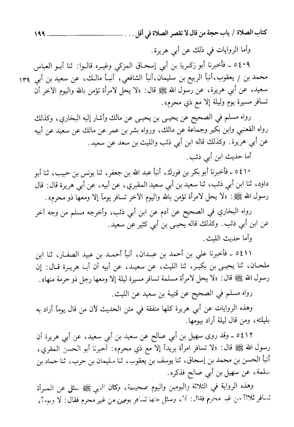 5411 - فَأَخْبَرَنَا عَلِيُّ بْنُ أَحْمَدَ بْنِ عَبْدَانَ، أنبأ أَحْمَدُ بْنُ عُبَيْدٍ الصَّفَّارُ، ثنا ابْنُ مِلْحَانَ، ثنا يَحْيَى بْنُ بُكَيْرٍ، ثنا اللَّيْثُ، عَنْ سَعِيدٍ، عَنْ أَبِيهِ، أَنَّ أَبَا هُرَيْرَةَ قَالَ: إِنَّ رَسُولَ اللهِ صَلَّى اللهُ عَلَيْهِ وَسَلَّمَ قَالَ: §" لَا يَحِلُّ لِامْرَأَةٍ مُسْلِمَةٍ تُسَافِرُ مَسِيرَةَ لَيْلَةٍ إِلَّا وَمَعَهَا رَجُلٌ ذُو حُرْمَةٍ مِنْهَا ". رَوَاهُ مُسْلِمٌ فِي الصَّحِيحِ عَنْ قُتَيْبَةَ بْنِ سَعِيدٍ عَنِ اللَّيْثِ، وَهَذِهِ الرِّوَايَاتُ عَنْ أَبِي هُرَيْرَةَ كُلُّهَا مُتَّفِقَةٌ فِي مَتْنِ الْحَدِيثِ، لِأَنَّ مَنْ قَالَ: يَوْمًا أَرَادَ بِهِ بِلَيْلَتِهِ، وَمَنْ قَالَ: لَيْلَةً أَرَادَ بِيَوْمِهَا