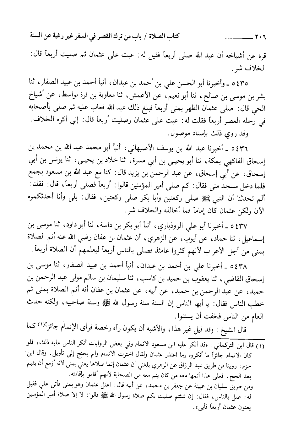 5438 - أَخْبَرَنَا عَلِيُّ بْنُ أَحْمَدَ بْنِ عَبْدَانَ، أنبأ أَحْمَدُ بْنُ عُبَيْدٍ الصَّفَّارُ، ثنا مُوسَى بْنُ إِسْحَاقَ الْقَاضِي، ثنا يَعْقُوبُ بْنُ حُمَيْدِ بْنِ كَاسِبٍ، ثنا سُلَيْمَانُ بْنُ سَالِمٍ مَوْلَى عَبْدِ الرَّحْمَنِ بْنِ حُمَيْدٍ، عَنْ عَبْدِ الرَّحْمَنِ بْنِ حُمَيْدٍ، عَنْ أَبِيهِ، عَنْ عُثْمَانَ بْنِ عَفَّانَ أَنَّهُ أَتَمَّ الصَّلَاةَ بِمِنًى، ثُمَّ خَطَبَ النَّاسَ فَقَالَ: " يَا أَيُّهَا النَّاسُ إِنَّ §السُّنَّةَ سُنَّةُ رَسُولِ اللهِ صَلَّى اللهُ عَلَيْهِ وَسَلَّمَ، وَسُنَّةُ صَاحِبَيْهِ، وَلَكِنَّهُ حَدَثَ الْعَامَ مِنَ النَّاسِ، فَخِفْتُ أَنْ يَسَتَنُّوا ". قَالَ الشَّيْخُ: وَقَدْ قِيلَ غَيْرُ هَذَا، وَالْأَشْبَهُ أَنْ يَكُونَ رَآهُ رُخْصَةً فَرَأَى الْإِتْمَامَ جَائِزًا كَمَا -[207]- رَأَتْهُ عَائِشَةُ، وَقَدْ رُوِيَ ذَلِكَ عَنْ غَيْرِ وَاحِدٍ مِنَ الصَّحَابَةِ مَعَ اخْتِيَارِهِمُ الْقَصْرَ