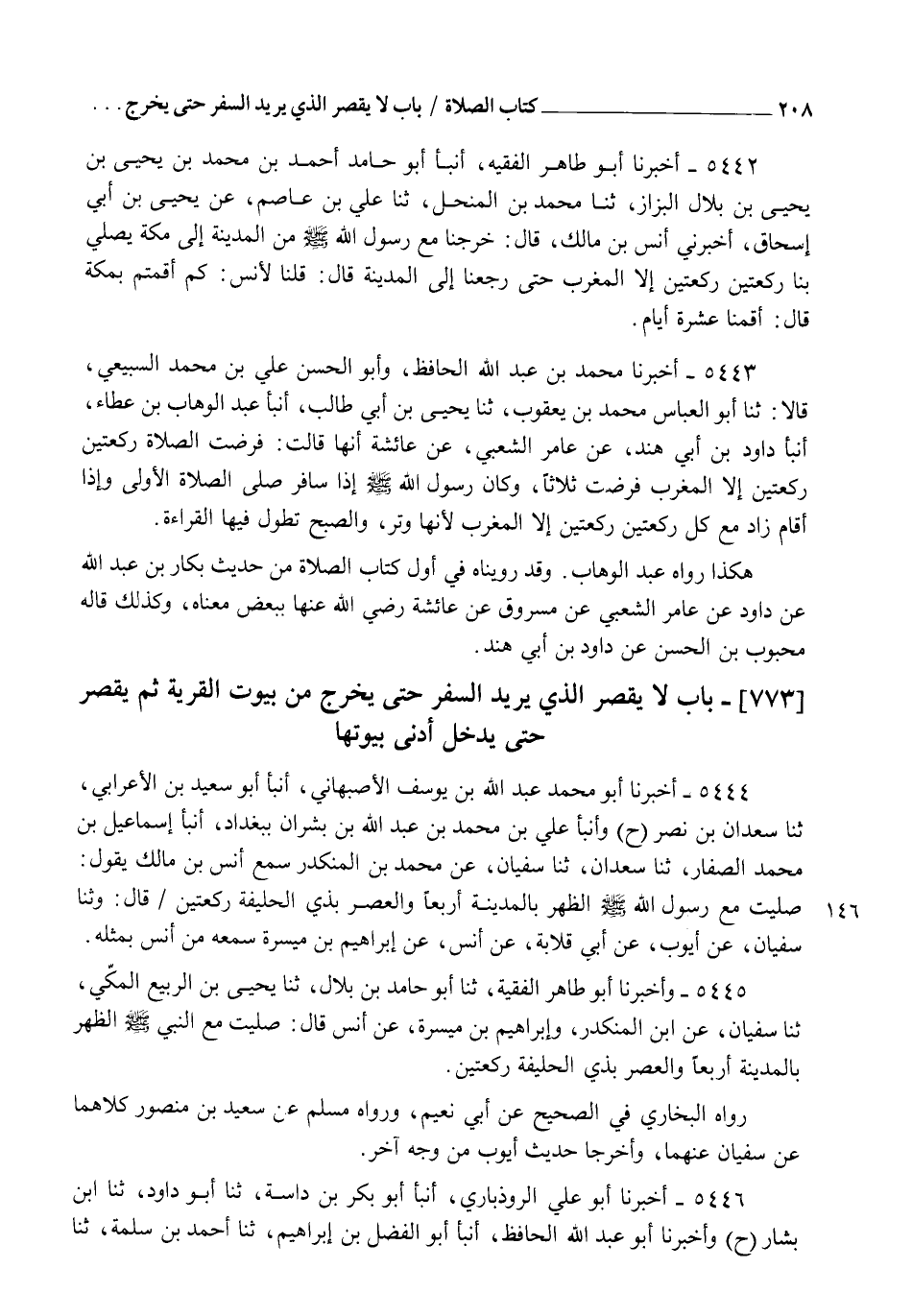 5444 - أَخْبَرَنَا أَبُو مُحَمَّدٍ عَبْدُ اللهِ بْنُ يُوسُفَ الْأَصْبَهَانِيُّ، أنبأ أَبُو سَعِيدِ بْنُ الْأَعْرَابِيِّ، ثنا سَعْدَانُ بْنُ نَصْرٍ، ح وَأنبأ عَلِيُّ بْنُ مُحَمَّدِ بْنِ عَبْدِ اللهِ بْنِ بِشْرَانَ بِبَغْدَادَ، أنبأ إِسْمَاعِيلُ بْنُ مُحَمَّدٍ الصَّفَّارُ، ثنا سَعْدَانُ، ثنا سُفْيَانُ، عَنْ مُحَمَّدِ بْنِ الْمُنْكَدِرِ، سَمِعَ أَنَسَ بْنَ مَالِكٍ يَقُولُ: §" صَلَّيْتُ مَعَ رَسُولِ اللهِ صَلَّى اللهُ عَلَيْهِ وَسَلَّمَ الظُّهْرَ بِالْمَدِينَةِ أَرْبَعًا، وَالْعَصْرَ بِذِي الْحُلَيْفَةِ رَكْعَتَيْنِ. قَالَ: وَثنا سُفْيَانُ، عَنْ أَيُّوبَ، عَنْ أَبِي قِلَابَةَ، عَنْ أَنَسٍ، عَنْ إِبْرَاهِيمَ بْنِ مَيْسَرَةَ، سَمِعَهُ مِنْ أَنَسٍ بِمِثْلِهِ