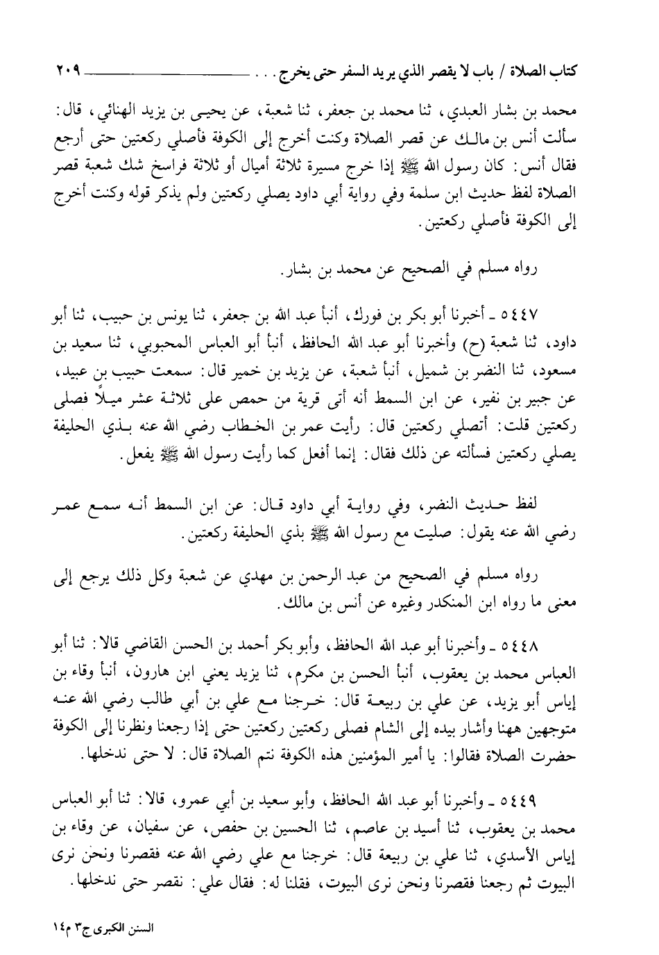 5447 - أَخْبَرَنَا أَبُو بَكْرِ بْنُ فُورَكٍ، أنبأ عَبْدُ اللهِ بْنُ جَعْفَرٍ، ثنا يُونُسُ بْنُ حَبِيبٍ، ثنا أَبُو دَاوُدَ، ثنا شُعْبَةُ، ح وَأَخْبَرَنَا أَبُو عَبْدِ اللهِ الْحَافِظُ، أنبأ أَبُو الْعَبَّاسِ الْمَحْبُوبِيُّ، ثنا سَعِيدُ بْنُ مَسْعُودٍ، ثنا النَّضْرُ بْنُ شُمَيْلٍ، أنبأ شُعْبَةُ، عَنْ يَزِيدَ بْنِ خُمَيْرٍ قَالَ: سَمِعْتُ حَبِيبَ بْنَ عُبَيْدٍ، عَنْ جُبَيْرِ بْنِ نُفَيْرٍ، عَنِ ابْنِ السِّمْطِ أَنَّهُ أَتَى قَرْيَةً مِنْ حِمْصَ عَلَى ثَلَاثَةَ عَشَرَ مِيلًا فَصَلَّى رَكْعَتَيْنِ، قُلْتُ: أَتُصَلِّي رَكْعَتَيْنِ؟ قَالَ: رَأَيْتُ عُمَرَ بْنَ الْخَطَّابِ رَضِيَ اللهُ عَنْهُ بِذِي الْحُلَيْفَةِ يُصَلِّي رَكْعَتَيْنِ، فَسَأَلْتُهُ عَنْ ذَلِكَ فَقَالَ: إِنَّمَا §أَفْعَلُ كَمَا رَأَيْتُ رَسُولَ اللهِ صَلَّى اللهُ عَلَيْهِ وَسَلَّمَ يَفْعَلُ ". لَفْظُ حَدِيثِ النَّضْرِ وَفِي رِوَايَةِ أَبِي دَاوُدَ قَالَ عَنِ ابْنِ السِّمْطِ أَنَّهُ سَمِعَ عُمَرَ رَضِيَ اللهُ عَنْهُ يَقُولُ: صَلَّيْتُ مَعَ رَسُولِ اللهِ صَلَّى اللهُ عَلَيْهِ وَسَلَّمَ بِذِي الْحُلَيْفَةِ رَكْعَتَيْنِ ". رَوَاهُ مُسْلِمٌ فِي الصَّحِيحِ مِنْ عَبْدِ الرَّحْمَنِ بْنِ مَهْدِيٍّ عَنْ شُعْبَةَ، وَكُلُّ ذَلِكَ يَرْجِعُ إِلَى مَعْنَى مَا رَوَاهُ ابْنُ الْمُنْكَدِرِ وَغَيْرِهِ عَنْ أَنَسِ بْنِ مَالِكٍ