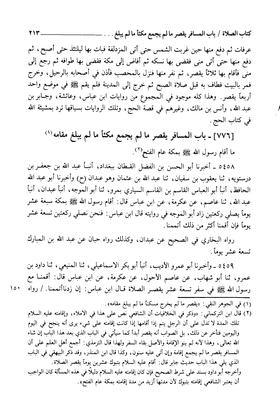 5458 - أَخْبَرَنَا أَبُو الْحُسَيْنِ بْنُ الْفَضْلِ الْقَطَّانُ بِبَغْدَادَ، أنبأ عَبْدُ اللهِ بْنُ جَعْفَرِ بْنِ دَرَسْتَوَيْهِ، ثنا يَعْقُوبُ بْنُ سُفْيَانَ، ثنا عَبْدُ اللهِ بْنُ عُثْمَانَ وَهُوَ عَبْدَانُ وَأَخْبَرَنَا أَبُو عَبْدِ اللهِ الْحَافِظُ، أنبأ أَبُو الْعَبَّاسِ الْقَاسِمُ بْنُ الْقَاسِمِ السَّيَّارِيُّ، بِمَرْوَ، ثنا أَبُو الْمُوَجِّهِ، أنبأ عَبْدَانُ، أنبأ عَبْدُ اللهِ، ثنا عَاصِمٌ، عَنْ عِكْرِمَةَ، عَنِ ابْنِ عَبَّاسٍ قَالَ: §" أَقَامَ رَسُولُ اللهِ صَلَّى اللهُ عَلَيْهِ وَسَلَّمَ بِمَكَّةَ سَبْعَةَ عَشَرَ يَوْمًا يُصَلِّي رَكْعَتَيْنِ ". زَادَ أَبُو الْمُوَجِّهِ فِي رِوَايَتِهِ: قَالَ ابْنُ عَبَّاسٍ: فَنَحْنُ نُصَلِّي رَكْعَتَيْنِ تِسْعَةَ عَشَرَ يَوْمًا، فَإِنْ أَقَمْنَا أَكْثَرَ مِنْ ذَلِكَ أَتْمَمْنَا ". رَوَاهُ الْبُخَارِيُّ فِي الصَّحِيحِ عَنْ عَبْدَانَ، وَكَذَلِكَ رَوَاهُ حَبَّانُ عَنْ عَبْدِ اللهِ بْنِ الْمُبَارَكِ: تِسْعَةَ عَشَرَ يَوْمًا