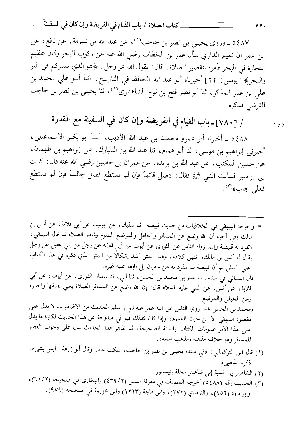 5487 - وَرَوَى يَحْيَى بْنُ نَصْرِ بْنِ حَاجِبٍ، عَنْ عَبْدِ اللهِ بْنِ شُبْرُمَةَ، عَنْ نَافِعٍ، عَنِ ابْنِ عُمَرَ " أَنَّ تَمِيمًا الدَّارِيَّ سَأَلَ عُمَرَ بْنَ الْخَطَّابِ رَضِيَ اللهُ عَنْهُ عَنْ رُكُوبِ الْبَحْرِ، وَكَانَ عَظِيمَ التِّجَارَةِ فِي الْبَحْرِ، §فَأَمَرَهُ بِتَقْصِيرِ الصَّلَاةِ، قَالَ: يَقُولُ اللهُ عَزَّ وَجَلَّ {هُوَ الَّذِي يُسَيِّرُكُمْ فِي الْبِرِّ وَالْبَحْرِ} [يونس: 22] ". أَخْبَرَنَاهُ أَبُو عَبْدِ اللهِ الْحَافِظُ فِي التَّارِيخِ، أنبأ أَبُو عَلِيٍّ مُحَمَّدُ بْنُ عَلِيِّ بْنِ عُمَرَ الْمُذَكِّرُ، ثنا أَبُو نَصْرٍ فَتْحُ بْنُ نُوحٍ الشَّاهَنْبَرِيُّ، ثنا يَحْيَى بْنُ نَصْرِ بْنِ حَاجِبٍ الْقُرَشِيُّ فَذَكَرَهُ