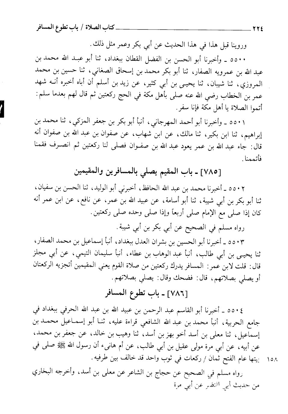 5504 - أَخْبَرَنَا أَبُو الْقَاسِمِ عَبْدُ الرَّحْمَنِ بْنُ عُبَيْدِ اللهِ بْنِ عَبْدِ اللهِ الْحُرْفِيُّ بِبَغْدَادَ فِي جَامِعِ الْحَرْبِيَّةِ، أنبأ مُحَمَّدُ بْنُ عَبْدِ اللهِ الشَّافِعِيُّ قِرَاءَةً عَلَيْهِ، ثنا أَبُو إِسْمَاعِيلَ مُحَمَّدُ بْنُ إِسْمَاعِيلَ، ثنا مُعَلَّى بْنُ أَسَدٍ أَخُو بَهْزِ بْنِ أَسَدٍ، ثنا وُهَيْبُ بْنُ خَالِدٍ، عَنْ جَعْفَرِ بْنِ مُحَمَّدٍ، عَنْ أَبِيهِ، عَنْ أَبِي مُرَّةَ مَوْلَى عَقِيلِ بْنِ أَبِي طَالِبٍ، عَنْ أُمِّ هَانِئٍ " أَنَّ رَسُولَ اللهِ صَلَّى اللهُ عَلَيْهِ وَسَلَّمَ §صَلَّى فِي بَيْتِهَا عَامَ الْفَتْحِ ثَمَانَ رَكَعَاتٍ فِي ثَوْبٍ وَاحِدٍ قَدْ خَالَفَ بَيْنَ طَرَفَيْهِ ". رَوَاهُ مُسْلِمٌ فِي الصَّحِيحِ، عَنْ حَجَّاجِ بْنِ الشَّاعِرِ، عَنْ مُعَلَّى بْنِ أَسَدٍ، وَأَخْرَجَهُ الْبُخَارِيُّ مِنْ حَدِيثِ أَبِي النَّضْرِ، عَنْ أَبِي مُرَّةَ