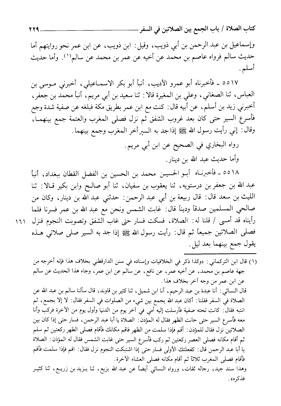 5518 - فَأَخْبَرَنَاهُ أَبُو الْحُسَيْنِ مُحَمَّدُ بْنُ الْحُسَيْنِ بْنِ الْفَضْلِ الْقَطَّانُ بِبَغْدَادَ، أنبأ عَبْدُ اللهِ بْنُ جَعْفَرِ بْنِ دَرَسْتَوَيْهِ، ثنا يَعْقُوبُ بْنُ سُفْيَانَ، ثنا أَبُو صَالِحٍ، وَابْنُ بُكَيْرٍ قَالَا: ثنا اللَّيْثُ بْنُ سَعْدٍ قَالَ: قَالَ رَبِيعَةُ بْنُ أَبِي عَبْدِ الرَّحْمَنِ، حَدَّثَنِي عَبْدُ اللهِ بْنُ دِينَارٍ، وَكَانَ مِنْ صَالِحِي الْمُسْلِمِينَ صِدْقًا وَدِينًا قَالَ: غَابَتِ الشَّمْسُ وَنَحْنُ مَعَ عَبْدِ اللهِ بْنِ عُمَرَ فَسِرْنَا، فَلَمَّا رَأَيْنَاهُ قَدْ أَمْسَى قُلْنَا لَهُ: الصَّلَاةَ، فَسَكَتَ، فَسَارَ حَتَّى غَابَ الشَّفَقُ، وَتَصَوَّبَتِ النُّجُومُ، فَنَزَلَ فَصَلَّى الصَّلَاتَيْنِ جَمِيعًا، ثُمَّ قَالَ: " رَأَيْتُ رَسُولَ اللهِ صَلَّى اللهُ عَلَيْهِ وَسَلَّمَ §إِذَا جَدَّ بِهِ السَّيْرُ صَلَّى صَلَاتِي هَذِهِ ". يَقُولُ: " جَمَعَ بَيْنَهُمَا بَعْدَ لَيْلٍ ". -[230]- وَأَمَّا حَدِيثُ إِسْمَاعِيلَ بْنِ عَبْدِ الرَّحْمَنِ