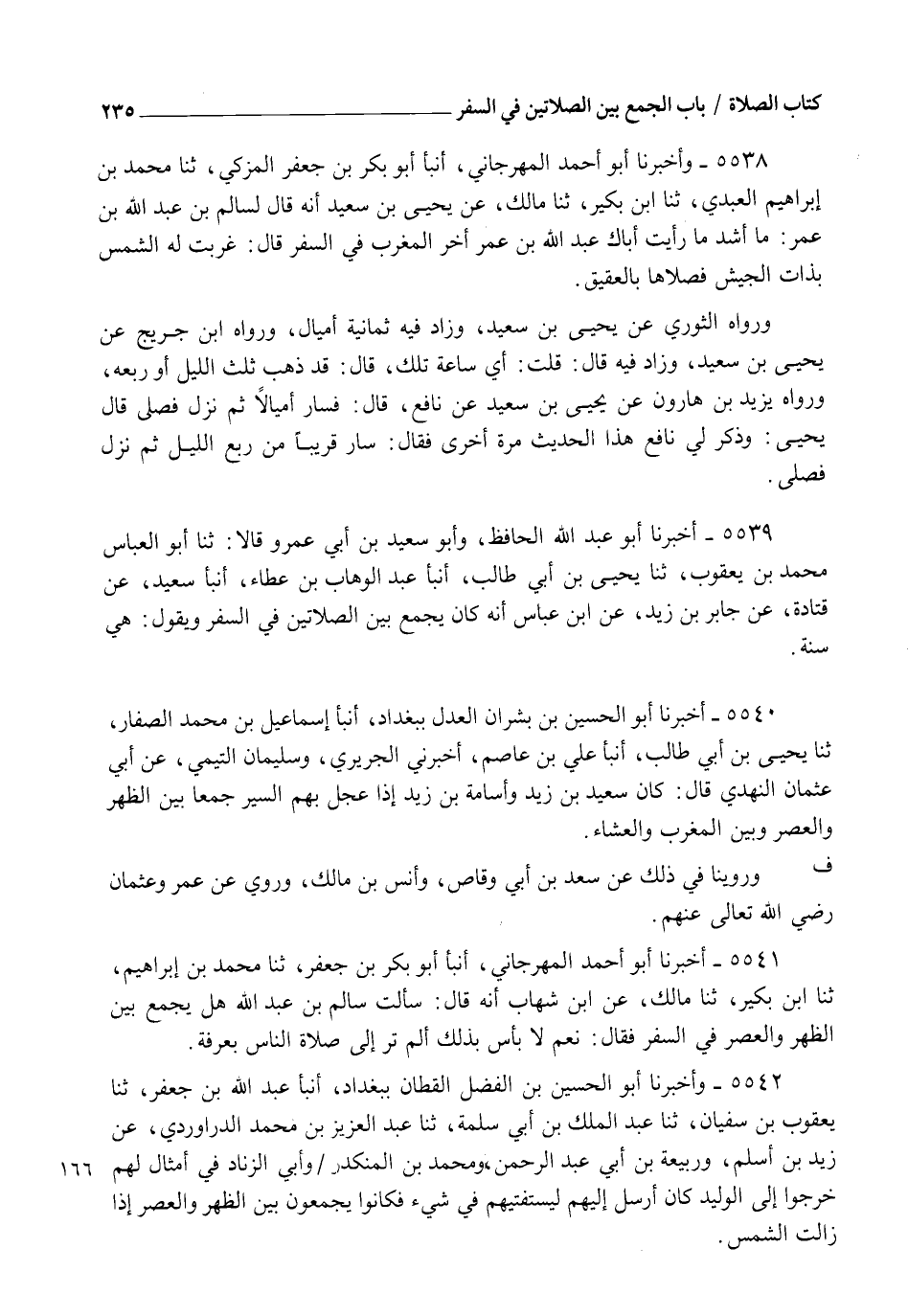 5538 - وَأَخْبَرَنَا أَبُو أَحْمَدَ الْمِهْرَجَانِيُّ، أنبأ أَبُو بَكْرِ بْنُ جَعْفَرٍ الْمُزَكِّي، ثنا مُحَمَّدُ بْنُ إِبْرَاهِيمَ الْعَبْدِيُّ، ثنا ابْنُ بُكَيْرٍ، ثنا مَالِكٌ، عَنْ يَحْيَى بْنِ سَعِيدٍ، أَنَّهُ قَالَ لِسَالِمِ بْنِ عَبْدِ اللهِ بْنِ عُمَرَ: " مَا أَشَدُّ مَا رَأَيْتُ أَبَاكَ عَبْدَ اللهِ بْنَ عُمَرَ أَخَّرَ الْمَغْرِبَ فِي السَّفَرِ؟ قَالَ: §" غَرَبَتْ لَهُ الشَّمْسُ بِذَاتِ الْجَيْشِ فَصَلَّاهَا بِالْعَقِيقِ ". وَرَوَاهُ الثَّوْرِيُّ، عَنْ يَحْيَى بْنِ سَعِيدٍ، وَزَادَ فِيهِ: ثَمَانِيَةَ أَمْيَالٍ، وَرَوَاهُ ابْنُ جُرَيْجٍ، عَنْ يَحْيَى بْنِ سَعِيدٍ وَزَادَ فِيهِ قَالَ: قُلْتُ: أِيُّ سَاعَةٍ تِلْكَ؟ قَالَ: قَدْ ذَهَبَ ثُلُثُ اللَّيْلِ أَوْ رُبْعُهُ، وَرَوَاهُ يَزِيدُ بْنُ هَارُونَ، عَنْ يَحْيَى بْنِ سَعِيدٍ، عَنْ نَافِعٍ قَالَ: فَسَارَ أَمْيَالًا ثُمَّ نَزَلَ فَصَلَّى، قَالَ يَحْيَى: وَذَكَرَ لِي نَافِعٌ هَذَا الْحَدِيثَ مَرَّةً أُخْرَى فَقَالَ: سَارَ قَرِيبًا مِنْ رُبْعِ اللَّيْلِ ثُمَّ نَزَلَ فَصَلَّى