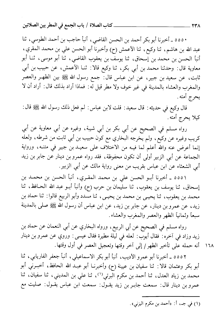 5550 - أَخْبَرَنَا أَبُو بَكْرٍ أَحْمَدُ بْنُ الْحَسَنِ الْقَاضِي، أنبأ حَاجِبُ بْنُ أَحْمَدَ الطُّوسِيُّ، ثنا عَبْدُ اللهِ بْنُ هَاشِمٍ، ثنا وَكِيعٌ، ثنا الْأَعْمَشُ، ح وَأَخْبَرَنَا أَبُو الْحَسَنِ عَلِيُّ بْنُ مُحَمَّدٍ الْمُقْرِئُ، أنبأ الْحَسَنُ بْنُ مُحَمَّدِ بْنِ إِسْحَاقَ، ثنا يُوسُفُ بْنُ يَعْقُوبَ الْقَاضِي، ثنا أَبُو مُوسَى، ثنا أَبُو مُعَاوِيَةَ قَالَ: وَحَدَّثَنَا مُحَمَّدُ بْنُ أَبِي بَكْرٍ، ثنا وَكِيعٌ قَالَا: ثنا الْأَعْمَشُ، عَنْ حَبِيبِ بْنِ أَبِي ثَابِتٍ، عَنْ سَعِيدِ بْنِ جُبَيْرٍ، عَنِ ابْنِ عَبَّاسٍ قَالَ: §" جَمَعَ رَسُولُ اللهِ صَلَّى اللهُ عَلَيْهِ وَسَلَّمَ بَيْنَ الظُّهْرِ وَالْعَصْرِ، وَالْمَغْرِبِ وَالْعِشَاءِ بِالْمَدِينَةِ فِي غَيْرِ خَوْفٍ وَلَا مَطَرٍ، قِيلَ لَهُ: فَمَاذَا أَرَادَ بِذَلِكَ؟ قَالَ: أَرَادَ أَنْ لَا يُحْرِجَ أُمَّتَهُ ". قَالَ وَكِيعٌ فِي حَدِيثِهِ: قَالَ سَعِيدٌ: قُلْتُ لِابْنِ عَبَّاسٍ: لِمَ فَعَلَ ذَلِكَ رَسُولُ اللهِ صَلَّى اللهُ عَلَيْهِ وَسَلَّمَ؟ قَالَ: كَيْلَا يُحْرِجَ أُمَّتَهُ. رَوَاهُ مُسْلِمٌ فِي الصَّحِيحِ عَنْ أَبِي بَكْرِ بْنِ أَبِي شَيْبَةَ وَغَيْرِهِ عَنْ أَبِي مُعَاوِيَةَ عَنْ أَبِي كُرَيْبٍ وَغَيْرِهِ عَنْ وَكِيعٍ، وَلَمْ يُخْرِجْهُ الْبُخَارِيُّ مَعَ كَوْنِ حَبِيبِ بْنِ أَبِي ثَابِتٍ مِنْ شَرْطِهِ، وَلَعَلَّهُ إِنَّمَا أَعْرَضَ عَنْهُ وَاللهُ أَعْلَمُ لِمَا فِيهِ مِنَ الِاخْتِلَافِ عَلَى سَعِيدِ بْنِ جُبَيْرٍ فِي مَتْنِهِ. وَرِوَايَةُ الْجَمَاعَةِ عَنْ أَبِي الزُّبَيْرِ أَوْلَى أَنْ تَكُونَ مَحْفُوظَةً، فَقَدْ رَوَاهُ عَمْرُو بْنُ دِينَارٍ عَنْ جَابِرِ بْنِ زَيْدٍ أَبِي الشَّعْثَاءِ عَنِ ابْنِ عَبَّاسٍ بِقَرِيبٍ مِنْ مَعْنَى رِوَايَةِ مَالِكٍ عَنْ أَبِي الزُّبَيْرِ