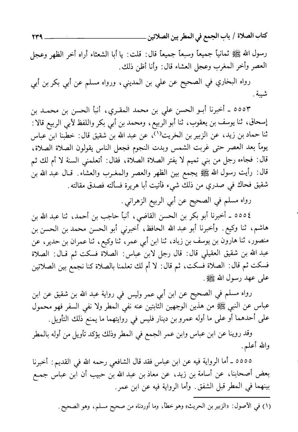 5553 - أَخْبَرَنَا أَبُو الْحَسَنِ عَلِيُّ بْنُ مُحَمَّدٍ الْمُقْرِئُ، أنبأ الْحَسَنُ بْنُ مُحَمَّدِ بْنِ إِسْحَاقَ، ثنا يُوسُفُ بْنُ يَعْقُوبَ، ثنا أَبُو الرَّبِيعِ، وَمُحَمَّدُ بْنُ أَبِي بَكْرٍ، وَاللَّفْظُ لِأَبِي الرَّبِيعِ قَالَا: ثنا حَمَّادُ بْنُ زَيْدٍ، عَنِ الزُّبَيْرِ بْنِ الْخِرِّيتِ، عَنْ عَبْدِ اللهِ بْنِ شَقِيقٍ قَالَ: خَطَبَنَا ابْنُ عَبَّاسٍ يَوْمًا بَعْدَ الْعَصْرِ حَتَّى غَرَبَتِ الشَّمْسُ، وَبَدَتِ النُّجُومُ فَجَعَلَ النَّاسُ يَقُولُونَ: الصَّلَاةَ الصَّلَاةَ، قَالَ: فَجَاءَهُ رَجُلٌ مِنْ بَنِي تَمِيمٍ لَا يَفْتُرُ: الصَّلَاةَ الصَّلَاةَ، فَقَالَ: " أَتُعَلِّمُنِي السُّنَّةَ لَا أُمَّ لَكَ "، ثُمَّ قَالَ: §" رَأَيْتُ رَسُولَ اللهِ صَلَّى اللهُ عَلَيْهِ وَسَلَّمَ يَجْمَعُ بَيْنَ الظُّهْرِ وَالْعَصْرِ، وَالْمَغْرِبِ وَالْعِشَاءِ ". قَالَ عَبْدُ اللهِ بْنُ شَقِيقٍ: فَحَاكَ فِي صَدْرِي مِنْ ذَلِكَ شَيْءٌ، فَأَتَيْتُ أَبَا هُرَيْرَةَ، فَسَأَلْتُهُ فَصَدَّقَ مَقَالَتَهُ ". رَوَاهُ مُسْلِمٌ فِي الصَّحِيحِ عَنْ أَبِي الرَّبِيعِ الزَّهْرَانِيِّ