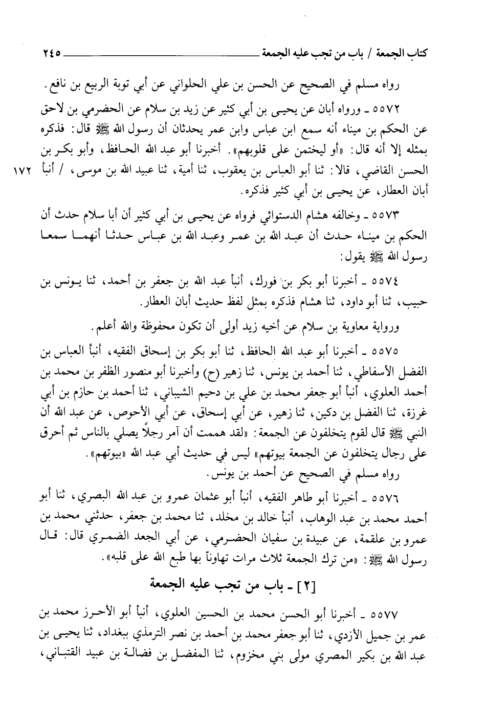 5575 - أَخْبَرَنَا أَبُو عَبْدِ اللهِ الْحَافِظُ، ثنا أَبُو بَكْرِ بْنُ إِسْحَاقَ الْفَقِيهُ، أنبأ الْعَبَّاسُ بْنُ الْفَضْلِ الْأَسْفَاطِيُّ، ثنا أَحْمَدُ بْنُ يُونُسَ، ثنا زُهَيْرٌ، ح وَأَخْبَرَنَا أَبُو مَنْصُورٍ الظَّفْرُ بْنُ مُحَمَّدِ بْنِ أَحْمَدَ الْعَلَوِيُّ، أنبأ أَبُو جَعْفَرٍ مُحَمَّدُ بْنُ عَلِيِّ بْنِ دُحَيْمٍ الشَّيْبَانِيُّ، ثنا أَحْمَدُ بْنُ حَازِمِ بْنِ أَبِي غَرَزَةَ، ثنا الْفَضْلُ بْنُ دُكَيْنٍ، ثنا زُهَيْرٌ، عَنْ أَبِي إِسْحَاقَ، عَنْ أَبِي الْأَحْوَصِ، عَنْ عَبْدِ اللهِ، أَنَّ النَّبِيَّ صَلَّى اللهُ عَلَيْهِ وَسَلَّمَ قَالَ لِقَوْمٍ يَتَخَلَّفُونَ عَنِ الْجُمُعَةِ: " لَقَدْ §هَمَمْتُ أَنْ آمُرَ رَجُلًا يُصَلِّي بِالنَّاسِ، ثُمَّ أُحَرِّقُ عَلَى رِجَالٍ يَتَخَلَّفُونَ عَنِ الْجُمُعَةِ بُيُوتَهُمْ ". لَيْسَ فِي حَدِيثِ أَبِي عَبْدِ اللهِ " بُيُوتَهُمْ ". رَوَاهُ مُسْلِمٌ فِي الصَّحِيحِ عَنْ أَحْمَدَ بْنِ يُونُسَ