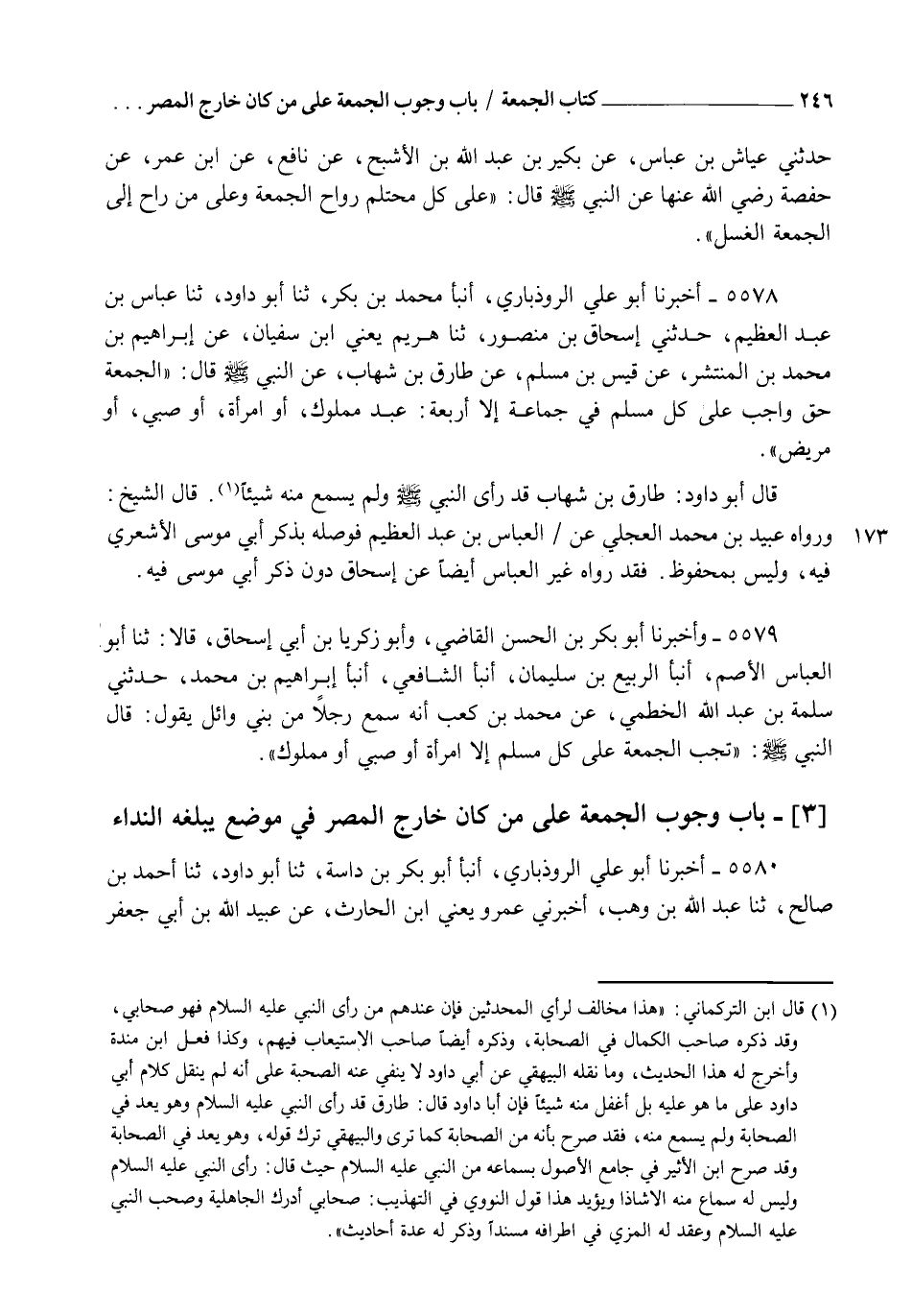 5578 - أَخْبَرَنَا أَبُو عَلِيٍّ الرَّوذْبَارِيُّ، أنبأ مُحَمَّدُ بْنُ بَكْرٍ، ثنا أَبُو دَاوُدَ، ثنا عَبَّاسُ بْنُ عَبْدِ الْعَظِيمِ، حَدَّثَنِي إِسْحَاقُ بْنُ مَنْصُورٍ، ثنا هُرَيْمٌ يَعْنِي ابْنَ سُفْيَانَ، عَنْ إِبْرَاهِيمَ بْنِ مُحَمَّدِ بْنِ الْمُنْتَشِرِ، عَنْ قَيْسِ بْنِ مُسْلِمٍ، عَنْ طَارِقِ بْنِ شِهَابٍ، عَنِ النَّبِيِّ صَلَّى اللهُ عَلَيْهِ وَسَلَّمَ قَالَ: §" الْجُمُعَةُ حَقٌّ وَاجِبٌ عَلَى كُلِّ مُسْلِمٍ فِي جَمَاعَةٍ إِلَّا أَرْبَعَةً: عَبْدٌ مَمْلُوكٌ، أَوِ امْرَأَةٌ، أَوْ صَبِيٌّ، أَوْ مَرِيضٌ ". قَالَ أَبُو دَاوُدَ: طَارِقُ بْنُ شِهَابٍ قَدْ رَأَى النَّبِيَّ صَلَّى اللهُ عَلَيْهِ وَسَلَّمَ وَلَمْ يَسْمَعْ مِنْهُ شَيْئًا. قَالَ الشَّيْخُ: وَرَوَاهُ عُبَيْدُ بْنُ مُحَمَّدٍ الْعِجْلِيُّ عَنِ الْعَبَّاسِ بْنِ عَبْدِ الْعَظِيمِ فَوَصَلَهُ بِذِكْرِ أَبِي مُوسَى الْأَشْعَرِيِّ فِيهِ، وَلَيْسَ بِمَحْفُوظٍ، فَقَدْ رَوَاهُ غَيْرُ الْعَبَّاسِ أَيْضًا عَنْ إِسْحَاقَ دُونَ ذِكْرِ أَبِي مُوسَى فِيهِ