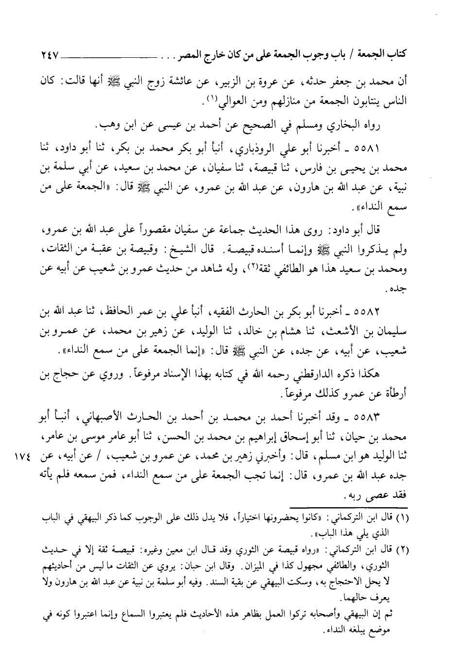 5581 - أَخْبَرَنَا أَبُو عَلِيٍّ الرُّوذْبَارِيُّ، أنبأ أَبُو بَكْرٍ مُحَمَّدُ بْنُ بَكْرٍ، ثنا أَبُو دَاوُدَ، ثنا مُحَمَّدُ بْنُ يَحْيَى بْنِ فَارِسٍ، ثنا قَبِيصَةُ، ثنا سُفْيَانُ، عَنْ مُحَمَّدِ بْنِ سَعِيدٍ، عَنْ أَبِي سَلَمَةَ بْنِ نُبَيْهٍ، عَنْ عَبْدِ اللهِ بْنِ هَارُونَ، عَنْ عَبْدِ اللهِ بْنِ عَمْرٍو، عَنِ النَّبِيِّ صَلَّى اللهُ عَلَيْهِ وَسَلَّمَ قَالَ: §" الْجُمُعَةُ عَلَى مَنْ سَمِعَ النِّدَاءَ ". قَالَ أَبُو دَاوُدَ: رَوَى هَذَا الْحَدِيثَ جَمَاعَةٌ عَنْ سُفْيَانَ مَقْصُورًا عَلَى عَبْدِ اللهِ بْنِ عَمْرٍو وَلَمْ يَذْكُرُوا النَّبِيَّ صَلَّى اللهُ عَلَيْهِ وَسَلَّمَ، وَإِنَّمَا أَسْنَدَهُ قَبِيصَةُ. قَالَ الشَّيْخُ: وَقَبِيصَةُ بْنُ عُقْبَةَ مِنَ الثِّقَاتِ، وَمُحَمَّدُ بْنُ سَعِيدٍ هَذَا هُوَ الطَّائِفِيُّ ثِقَةٌ، وَلَهُ شَاهِدٌ مِنْ حَدِيثِ عَمْرِو بْنِ شُعَيْبٍ عَنْ أَبِيهِ عَنْ جَدِّهِ