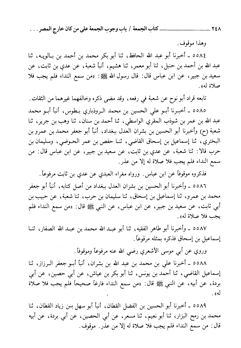 5584 - أَخْبَرَنَا أَبُو عَبْدِ اللهِ الْحَافِظُ، ثنا أَبُو بَكْرٍ مُحَمَّدُ بْنُ أَحْمَدَ بْنِ بَالَوَيْهِ، ثنا عَبْدُ اللهِ بْنُ أَحْمَدَ بْنِ حَنْبَلٍ، ثنا أَبُو مَعْمَرٍ، ثنا هُشَيْمٌ، أنبأ شُعْبَةُ، عَنْ عَدِيِّ بْنِ ثَابِتٍ، عَنْ سَعِيدِ بْنِ جُبَيْرٍ، عَنِ ابْنِ عَبَّاسٍ قَالَ: قَالَ رَسُولُ اللهِ صَلَّى اللهُ عَلَيْهِ وَسَلَّمَ: " §مَنْ سَمِعَ النِّدَاءَ فَلَمْ يُجِبْ، فَلَا صَلَاةَ لَهُ ". تَابَعَهُ قُرَادٌ أَبُو نُوحٍ، عَنْ شُعْبَةَ فِي رَفْعِهِ وَقَدْ مَضَى ذِكْرُهُ، وَخَالَفَهُمَا غَيْرُهُمَا مِنَ الثِّقَاتِ
