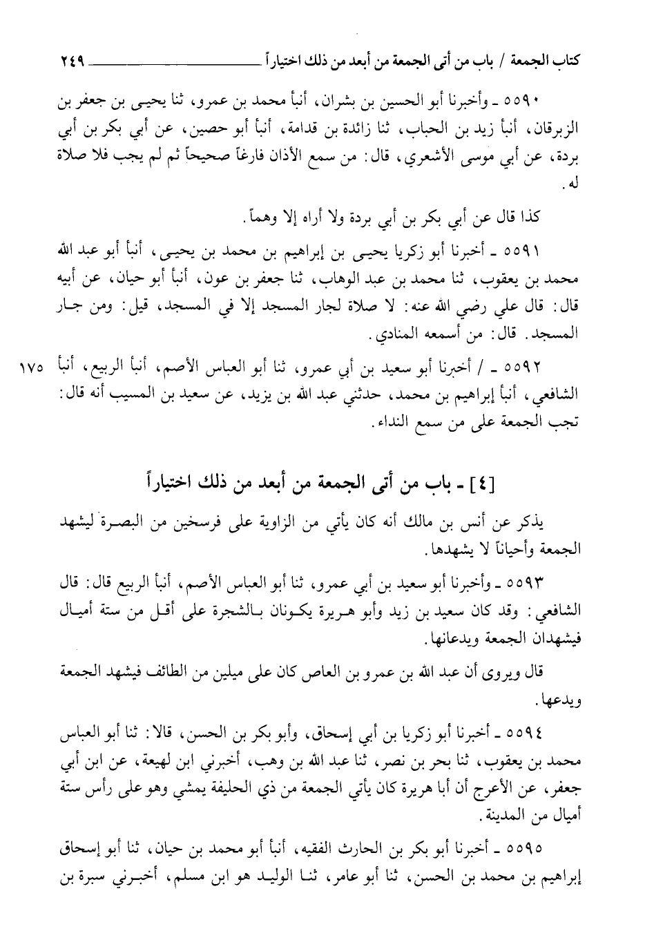 5593 - أَخْبَرَنَا أَبُو سَعِيدِ بْنُ أَبِي عَمْرٍو، ثنا أَبُو الْعَبَّاسِ الْأَصَمُّ، أنبأ الرَّبِيعُ قَالَ: قَالَ الشَّافِعِيُّ: " وَقَدْ §كَانَ سَعِيدُ بْنُ زَيْدٍ، وَأَبُو هُرَيْرَةَ يَكُونَانِ بِالشَّجَرَةِ عَلَى أَقَلَّ مِنْ سِتَّةِ أَمْيَالٍ فَيَشْهَدَانِ الْجُمُعَةَ وَيَدَعَانِهَا " قَالَ: " وَيُرْوَى أَنَّ عَبْدَ اللهِ بْنَ عَمْرِو بْنِ الْعَاصِ كَانَ عَلَى مِيلَيْنِ مِنَ الطَّائِفِ فَيَشْهَدُ الْجُمُعَةَ وَيَدَعُهَا "