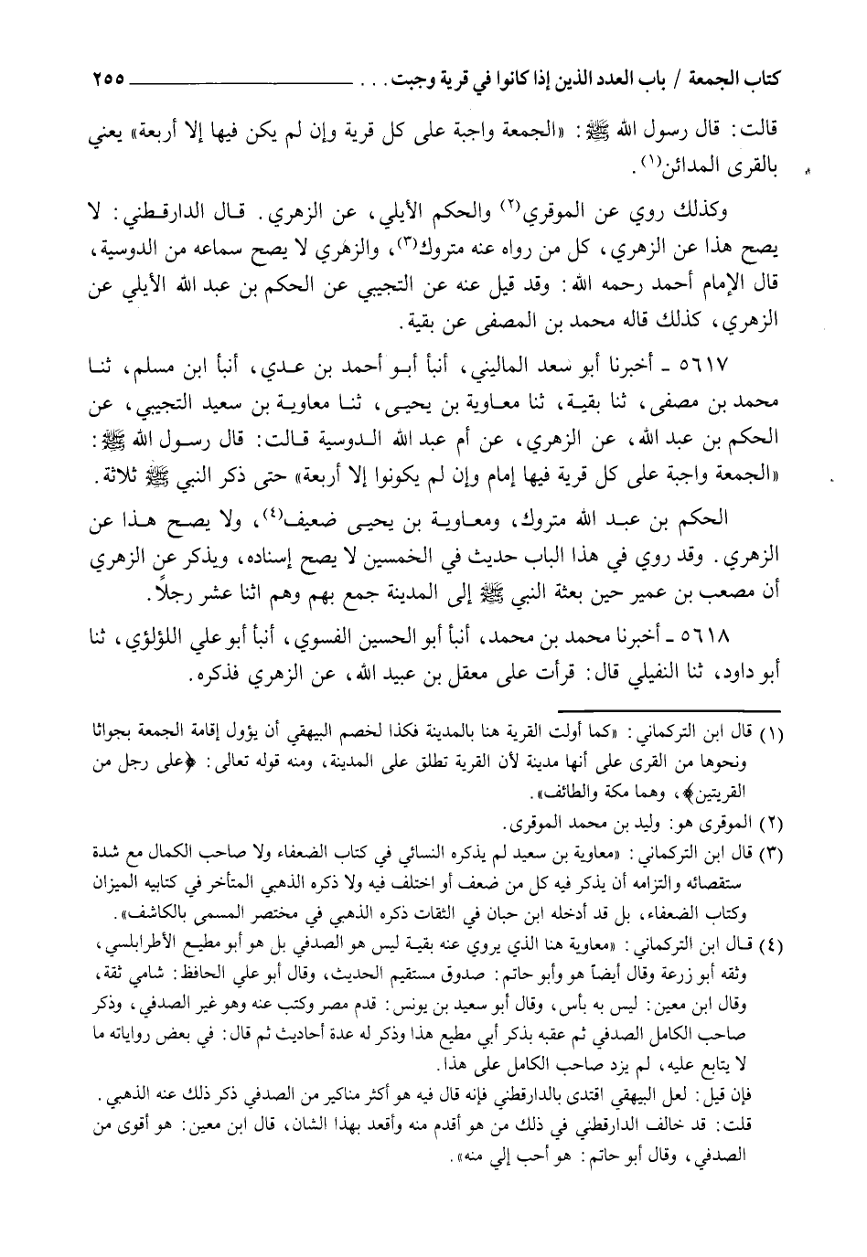 5617 - أَخْبَرَنَا أَبُو سَعْدٍ الْمَالِينِيُّ، أنبأ أَبُو أَحْمَدَ بْنِ عَدِيٍّ، أنبا ابْنُ مُسْلِمٍ، ثنا مُحَمَّدُ بْنُ مُصَفَّى، ثنا بَقِيَّةُ، ثنا مُعَاوِيَةُ بْنُ يَحْيَى، ثنا مُعَاوِيَةُ بْنُ سَعِيدٍ التُّجِيبِيُّ، عَنِ الْحَكَمِ بْنِ عَبْدِ اللهِ، عَنِ الزُّهْرِيِّ، عَنْ أُمِّ عَبْدِ اللهِ الدَّوْسِيَّةِ قَالَتْ: قَالَ رَسُولُ اللهِ صَلَّى اللهُ عَلَيْهِ وَسَلَّمَ: " §الْجُمُعَةُ وَاجِبَةٌ عَلَى كُلِّ قَرْيَةٍ فِيهَا إِمَامٌ، وَإِنْ لَمْ يَكُونُوا إِلَّا أَرْبَعَةً ". حَتَّى ذَكَرَ النَّبِيُّ صَلَّى اللهُ عَلَيْهِ وَسَلَّمَ ثَلَاثَةً ". الْحَكَمُ بْنُ عَبْدِ اللهِ مَتْرُوكٌ، وَمُعَاوِيَةُ بْنُ يَحْيَى ضَعِيفٌ، وَلَا يَصِحُّ هَذَا عَنِ الزُّهْرِيِّ، وَقَدْ رُوِيَ فِي هَذَا الْبَابِ حَدِيثٌ فِي الْخَمْسِينَ لَا يَصِحُّ إِسْنَادُهُ وَيُذْكَرُ، عَنِ الزُّهْرِيِّ، §" أَنَّ مُصْعَبَ بْنَ عُمَيْرٍ حِينَ بَعَثَهُ النَّبِيُّ صَلَّى اللهُ عَلَيْهِ وَسَلَّمَ إِلَى الْمَدِينَةِ جَمَّعَ بِهِمْ وَهُمُ اثْنَا عَشَرَ رَجُلًا ".