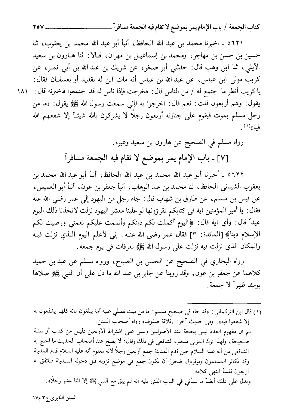 5621 - أَخْبَرَنَا مُحَمَّدُ بْنُ عَبْدِ اللهِ الْحَافِظُ، أنبأ أَبُو عَبْدِ اللهِ مُحَمَّدُ بْنُ يَعْقُوبَ، ثنا حُسَيْنُ بْنُ حَسَنِ بْنِ مُهَاجِرٍ، وَمُحَمَّدُ بْنُ إِسْمَاعِيلَ بْنِ مِهْرَانَ قَالَا: ثنا هَارُونُ بْنُ سَعِيدٍ الْأَيْلِيُّ، ثنا ابْنُ وَهْبٍ قَالَ: حَدَّثَنِي أَبُو صَخْرٍ، عَنْ شَرِيكِ بْنِ عَبْدِ اللهِ بْنِ أَبِي نَمِرٍ، عَنْ كُرَيْبٍ مَوْلَى ابْنِ عَبَّاسٍ عَنْ عَبْدِ اللهِ بْنِ عَبَّاسٍ أَنَّهُ مَاتَ ابْنٌ لَهُ بِقُدَيْدٍ أَوْ بِعُسْفَانَ فَقَالَ: يَا كُرَيْبُ، انْظُرْ مَا اجْتَمَعَ لَهُ مِنَ النَّاسِ، قَالَ: فَخَرَجْتُ فَإِذَا نَاسٌ لَهُ قَدِ اجْتَمَعُوا فَأَخْبَرْتُهُ، قَالَ: يَقُولُ: وَهُمْ أَرْبَعُونَ؟ قُلْتُ: نَعَمْ، قَالَ: اخْرُجُوا بِهِ، فَإِنِّي سَمِعْتُ رَسُولَ اللهِ صَلَّى اللهُ عَلَيْهِ وَسَلَّمَ يَقُولُ: §" مَا مِنْ رَجُلٍ مُسْلِمٍ يَمُوتُ فَيَقُومُ عَلَى جِنَازَتِهِ أَرْبَعُونَ رَجُلًا لَا يُشْرِكُونَ بِاللهِ شَيْئًا، إِلَّا شَفَّعَهُمُ اللهُ فِيهِ ". رَوَاهُ مُسْلِمٌ فِي الصَّحِيحِ عَنْ هَارُونَ بْنِ سَعِيدٍ وَغَيْرِهِ