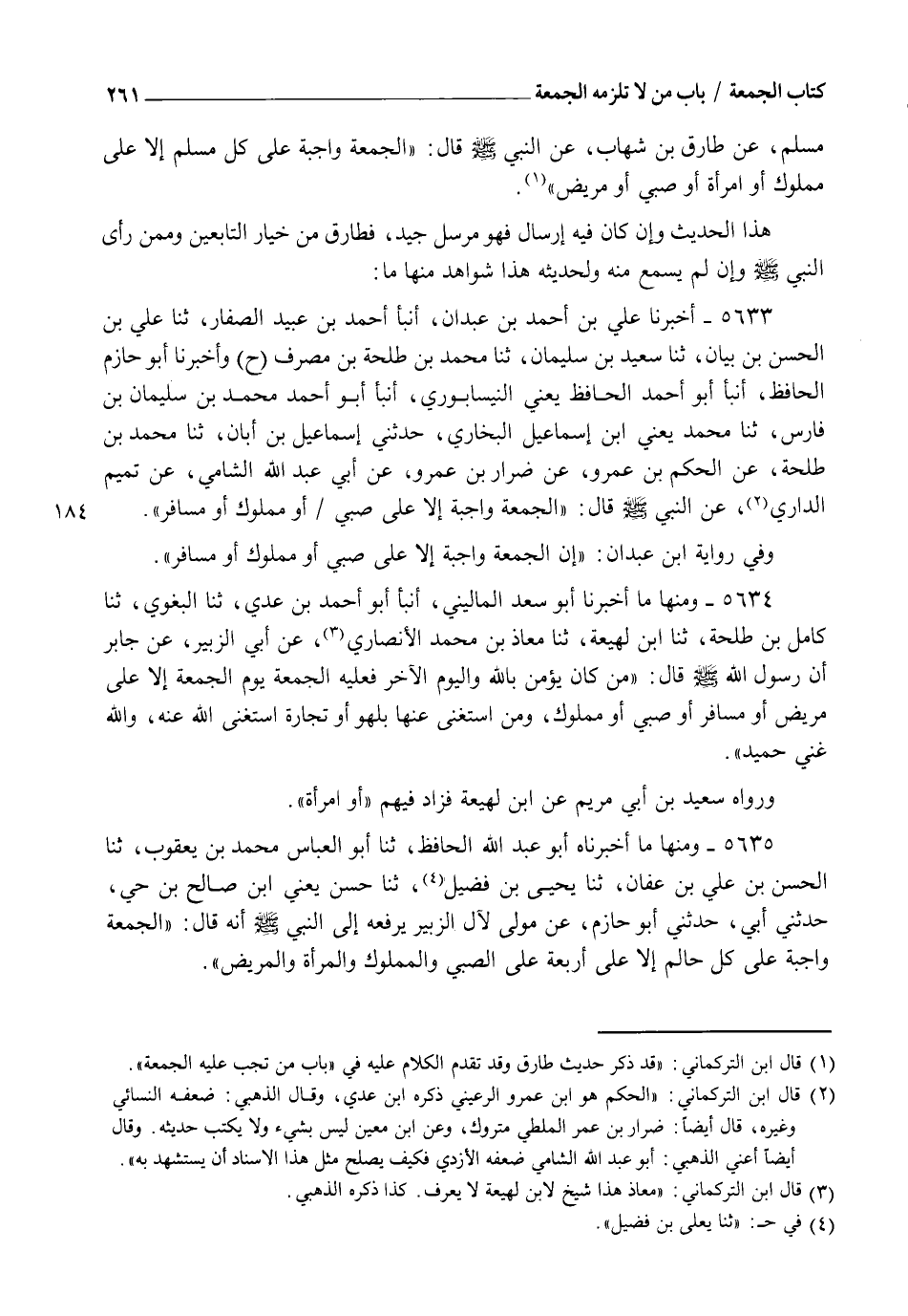 5635 - وَمِنْهَا مَا أَخْبَرَنَاهُ أَبُو عَبْدِ اللهِ الْحَافِظُ، ثنا أَبُو الْعَبَّاسِ مُحَمَّدُ بْنُ يَعْقُوبَ، ثنا الْحَسَنُ بْنُ عَلِيِّ بْنِ عَفَّانَ، ثنا يَحْيَى بْنُ فُضَيْلٍ، ثنا حَسَنٌ يَعْنِي ابْنَ صَالِحِ بْنِ حَيٍّ، حَدَّثَنِي أَبِي، حَدَّثَنِي أَبُو حَازِمٍ، عَنْ مَوْلًى لِآلِ الزُّبَيْرِ يَرْفَعُهُ إِلَى النَّبِيِّ صَلَّى اللهُ عَلَيْهِ وَسَلَّمَ أَنَّهُ قَالَ: " §الْجُمُعَةُ وَاجِبَةٌ عَلَى كُلِّ حَالِمٍ، إِلَّا عَلَى أَرْبَعَةٍ، عَلَى الصَّبِيِّ، وَالْمَمْلُوكِ، وَالْمَرْأَةِ، وَالْمَرِيضِ "